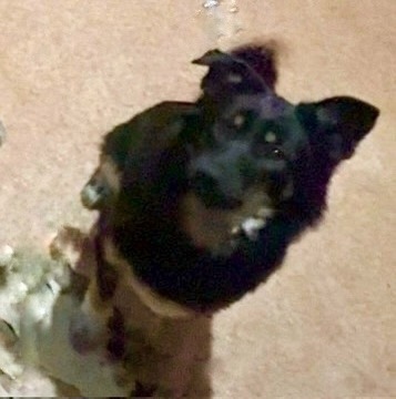 Описание:сама чёрная,белые бровки, лапки и шейка. Небольшая, до колена!