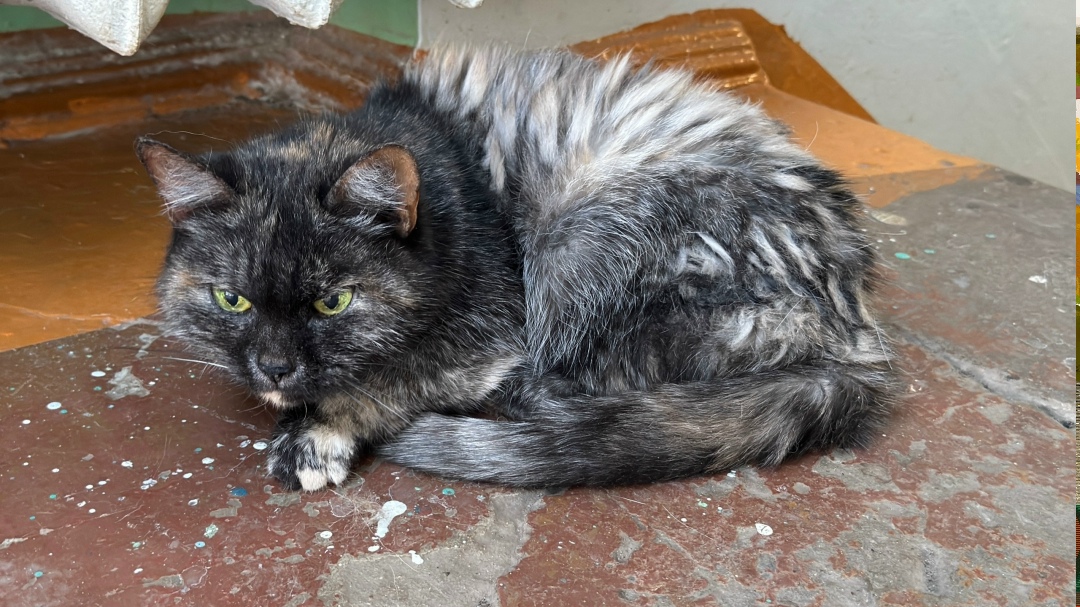 В подъезде октябрьский проспект 102 найдена трехцветная кошка. Вся в колтунах, но людей, собак, кошек не боится. Из рук ест и гладить себя дает, мурчит. Возможно бывшедомашняя.