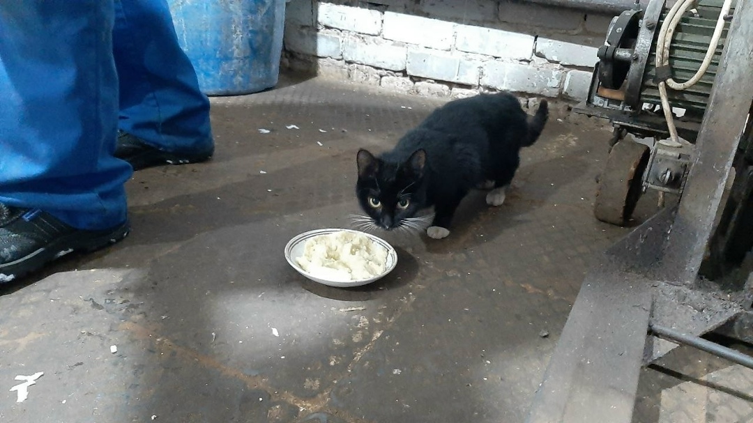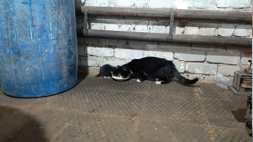 Прибилась кошечка на производство, через время родила котёнка. Кошка умная, о котёнке заботится. На руки пока не идёт.