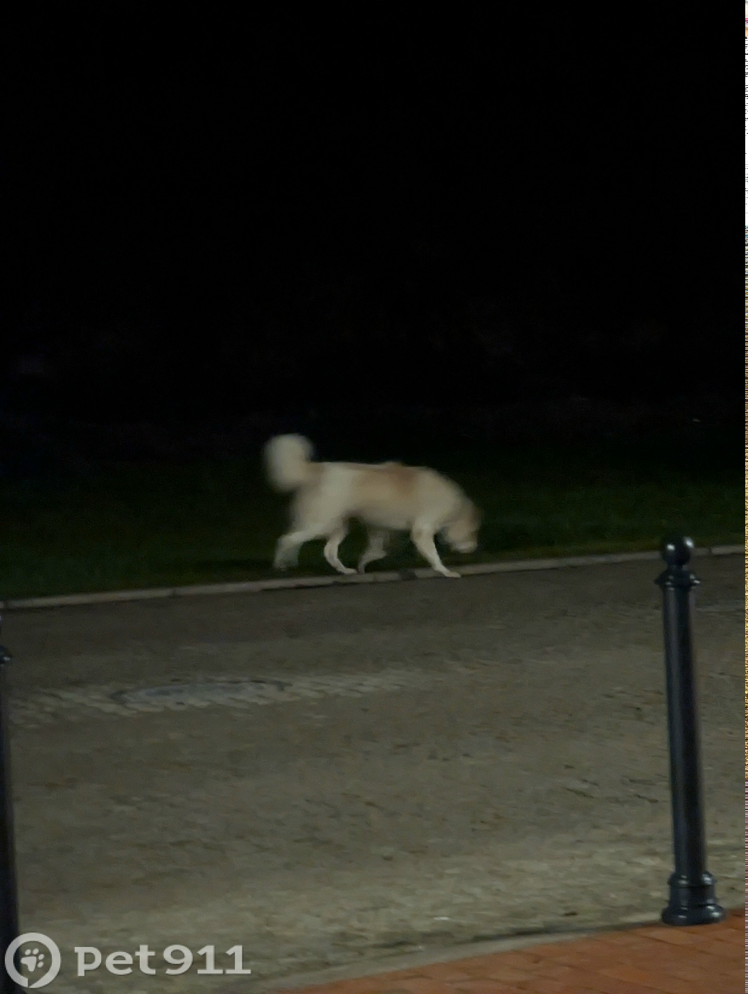 Найден кобель белый с ошейником, бегает вдоль набережной в Светлогорске (Калининградская область).