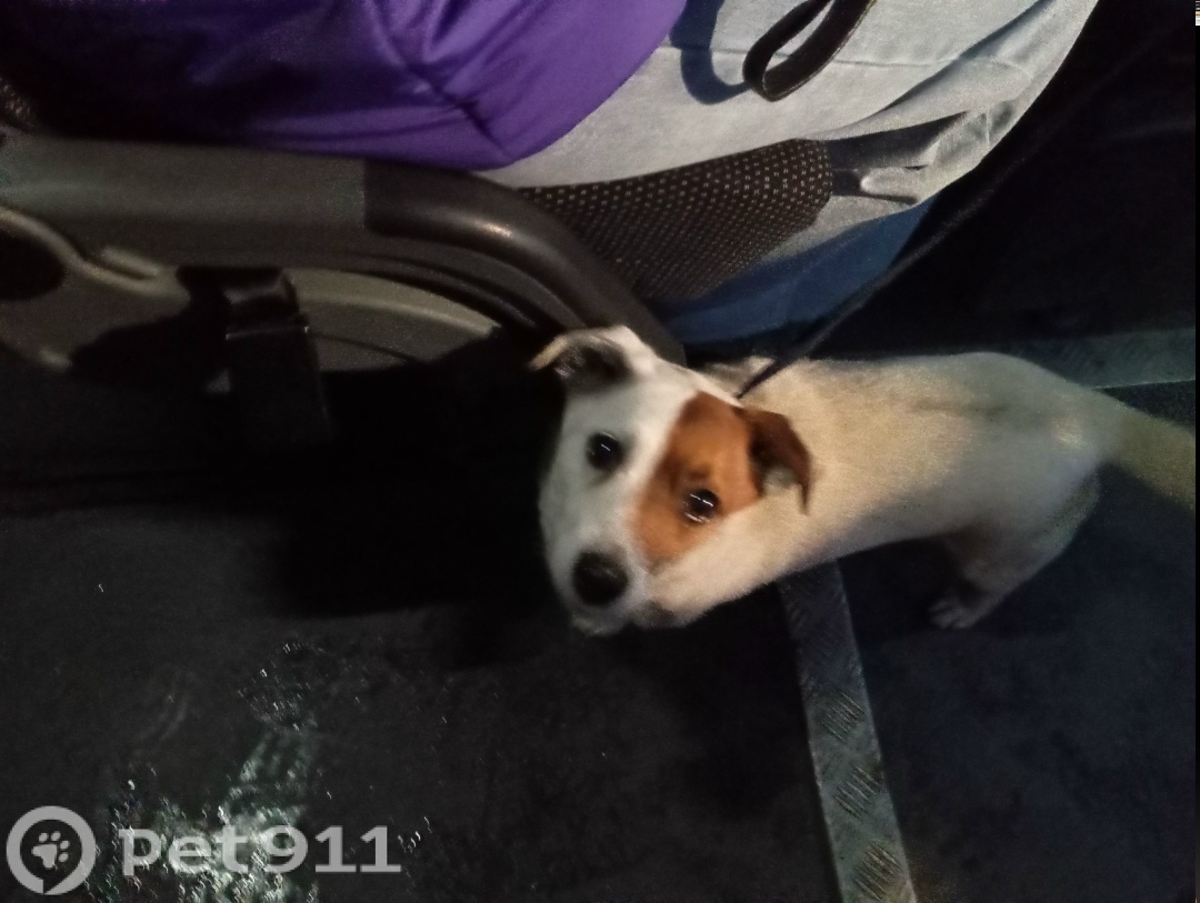 Пёсик в ошейнике, с поводком, окрас белый, морда бело-рыжая, ласковый, идёт на контакт.