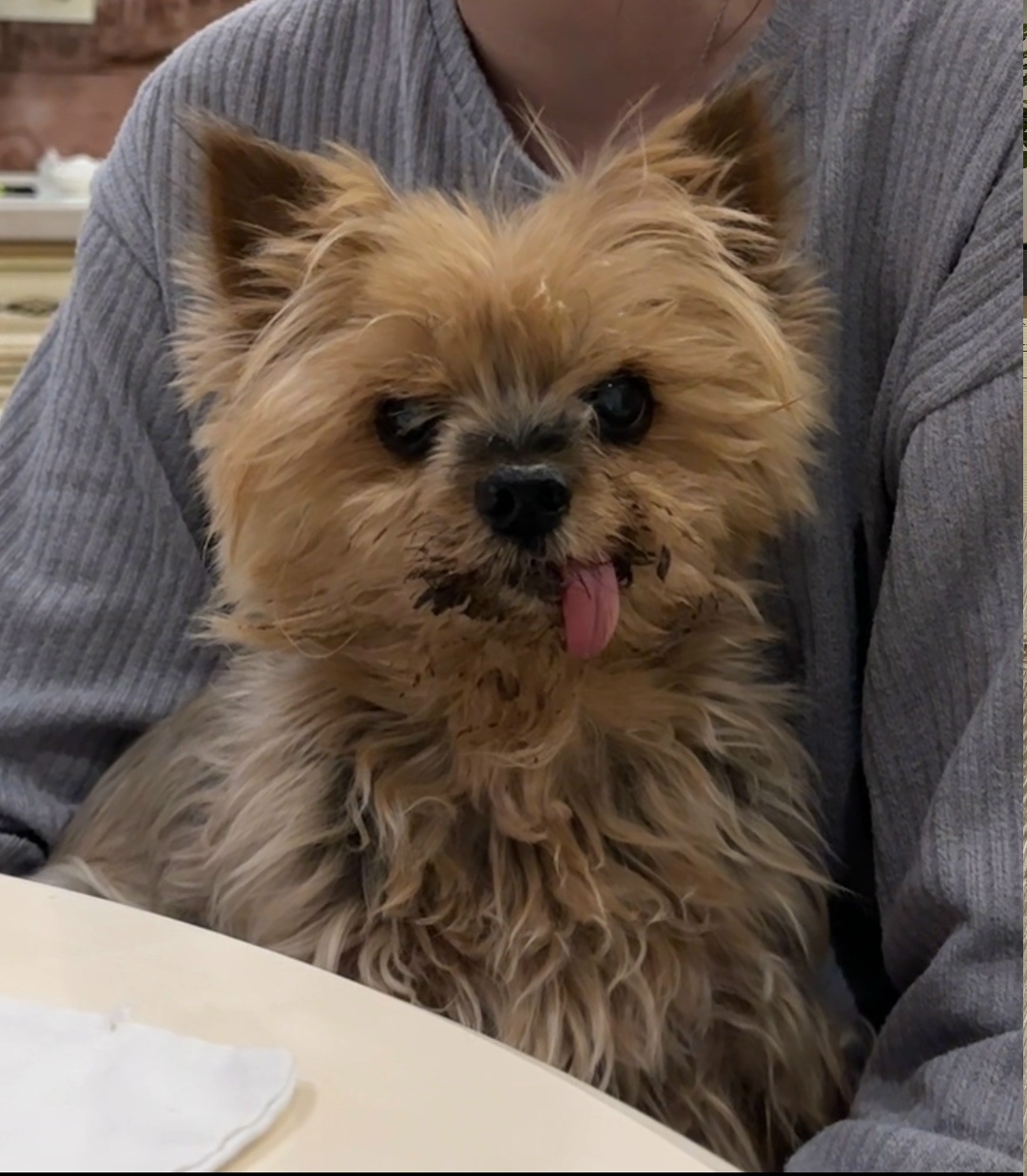 Стриженый недавно, из отличительных особенностей - отсутствие зубов, и язык на бок вываливается, есть папилома на голове