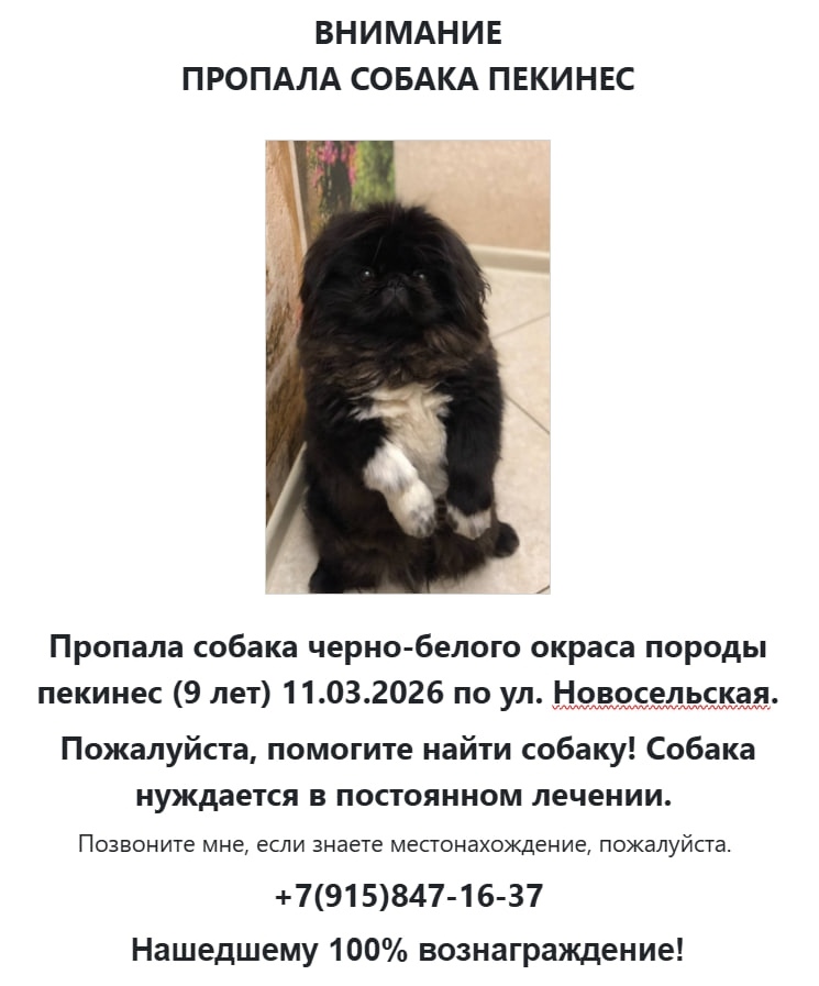 11.03. Пропал пекинес, район Текстильщиков. Черно-белый окрас. Собаке 9 лет, нуждается в постоянном лечении.