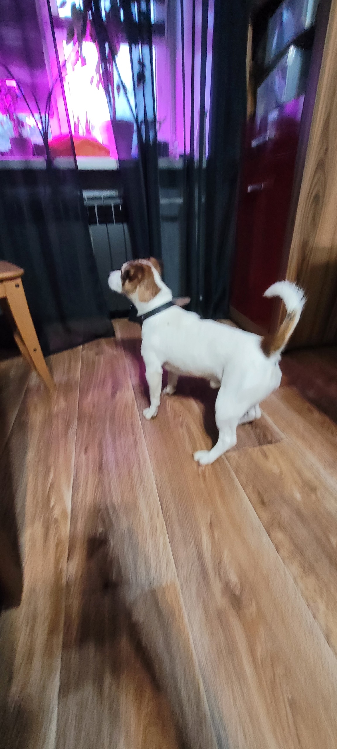 Найдена собака породы джек рассел Собака бежала вдоль проезжей части несколько остановок. Людей отходила стороной, но к детям подошла. Дети поймали. Собаки не пугливая. Не боится людей, собак, машин.