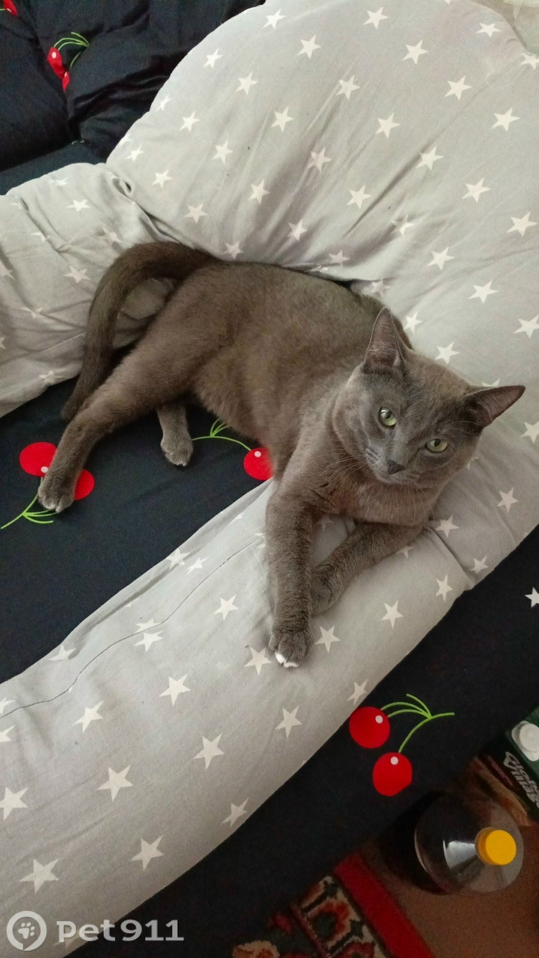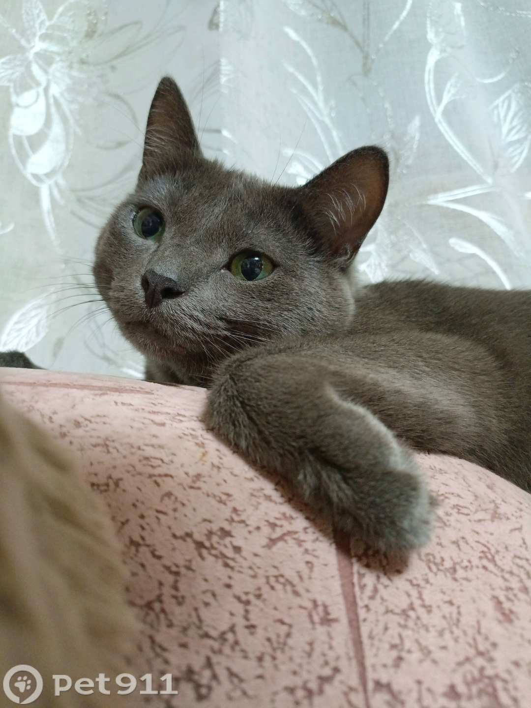 Серый , кастрированный кот , на левой брови небольшой шрамик, на правой передней лапке 2 белых пальчика и одна розовая подушечка остальные темные.