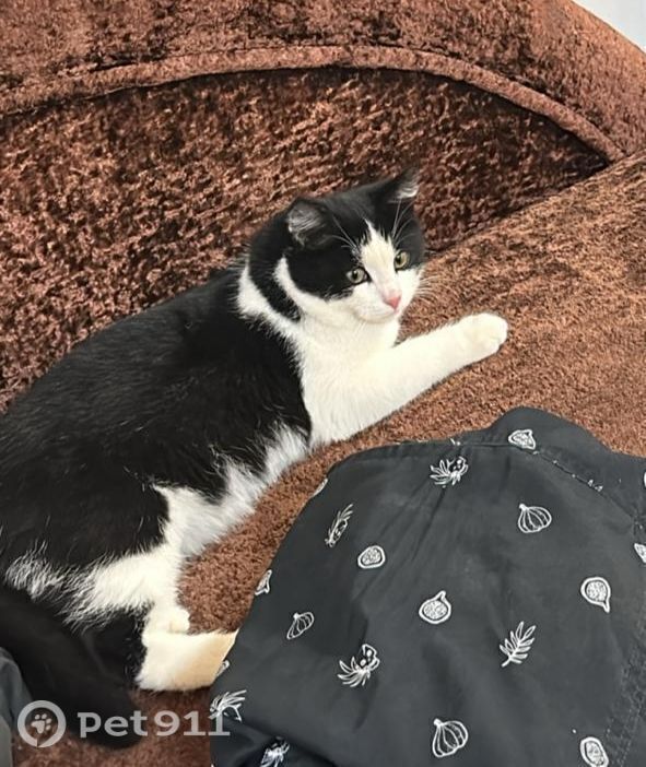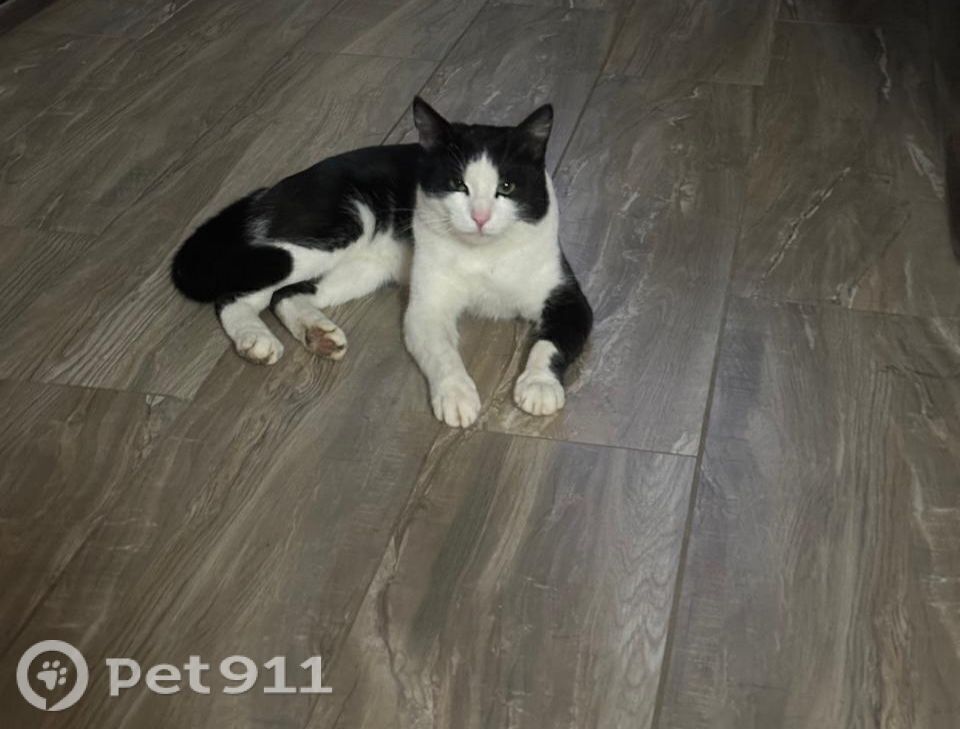 Чёрно-белый окрас, беспородный. Не кастрирован. Левая лапка полностью белая, правая черная, внизу как белый носочек. К людям чужим не подходит, недоверчив.