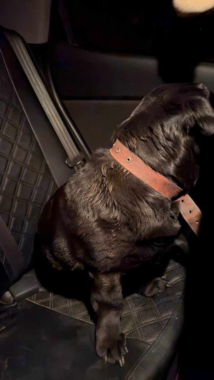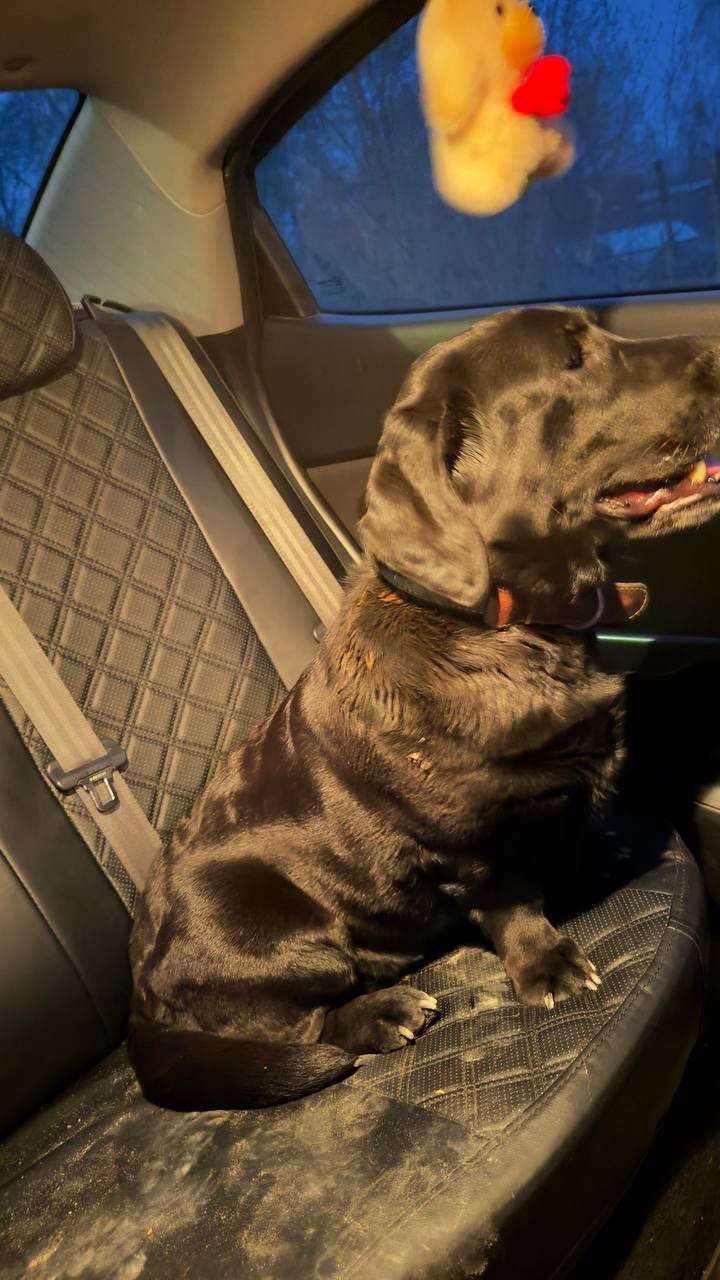 Сама запрыгнула в машину и легла. Собака с ошейником, упитанная, активная, лезет к человеку, в машине совершенно спокойно ехала