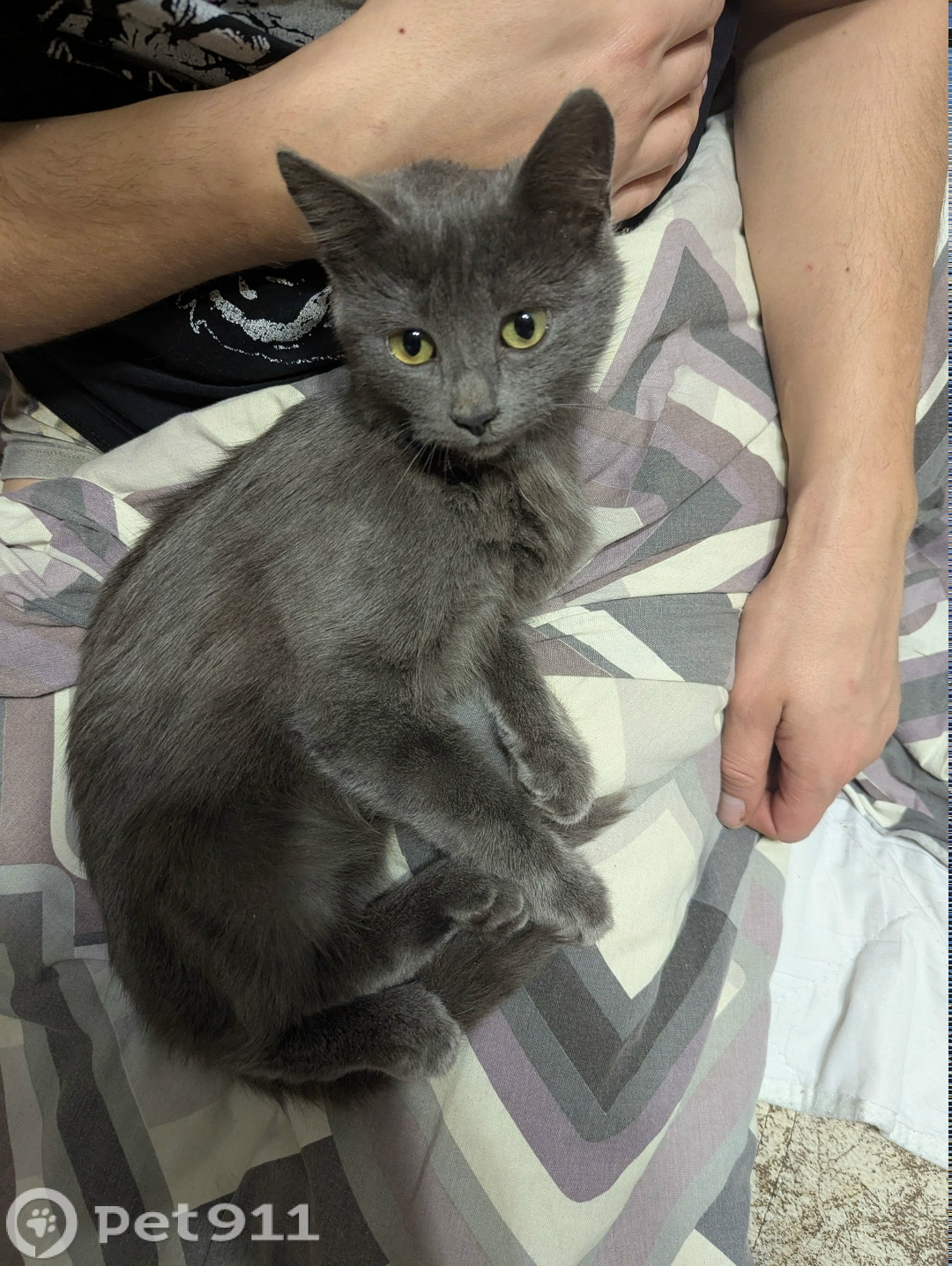 Кот примерно 6-7 месяцев, окрас ровный серый, глаза зелёные. Абсолютно чистый, без травм, не боится людей. Похоже, что убежал/потерялся совсем недавно