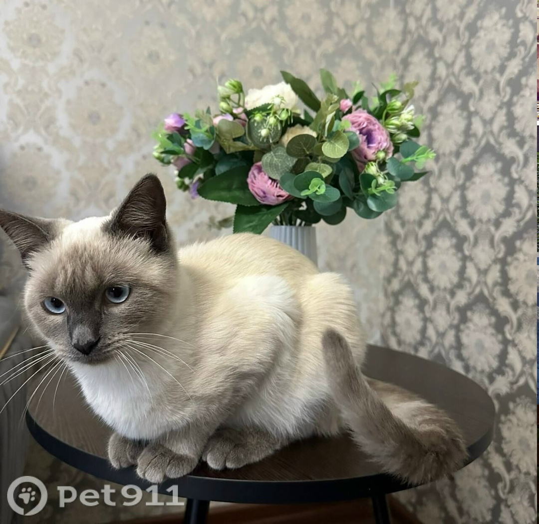 Сиамская красавица, ушки лапки мордочка хвостик чёрные, сама белая, скорее сероватая, добрая доверчивая, возможно пугаться будет