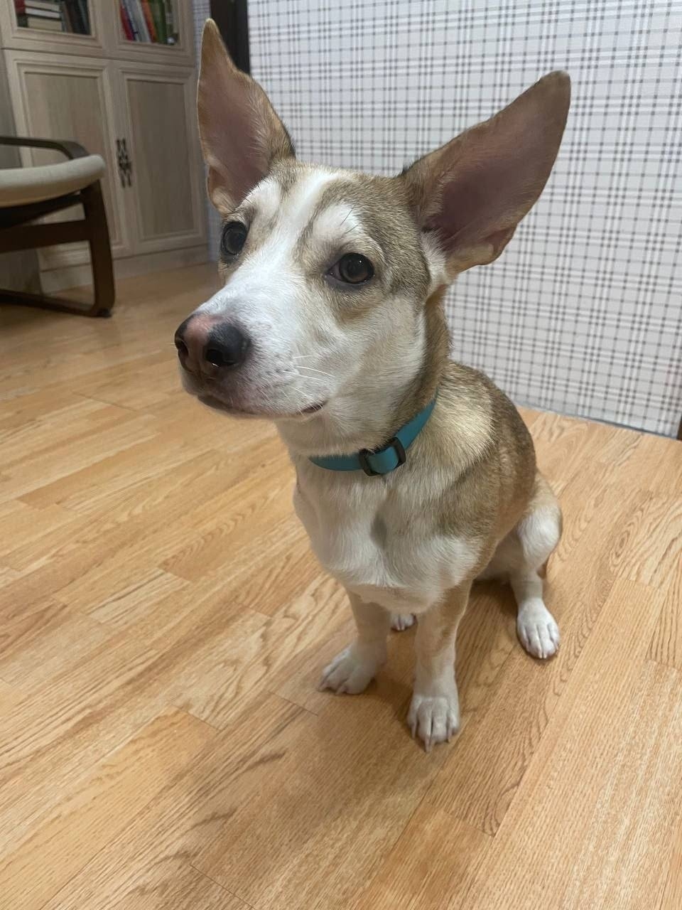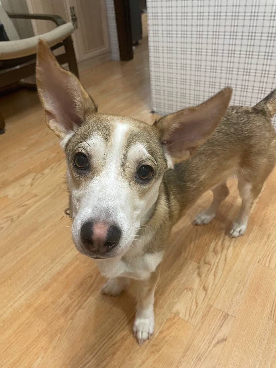 Девочка, похожа на метис корги, скорее всего щенок месяцев 9, окрас бело бежевый, зеленый силиконовый ошейник, чипа нет. Пока придержана, но возможности держать долго нет