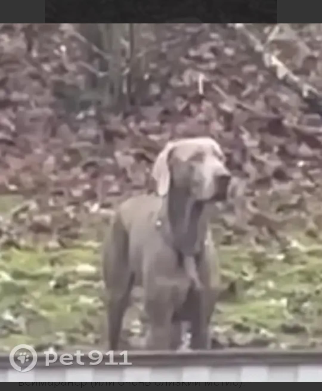 В районе Лайково (МО) замечена собака породы веймаранер (или очень близкий метис). • Крупная, высокая • Серо-серебристый окрас • Короткая гладкая шерсть • Висячие уши • Синий ошейник Собака явно домашняя, не приспособлена к жизни на улице
