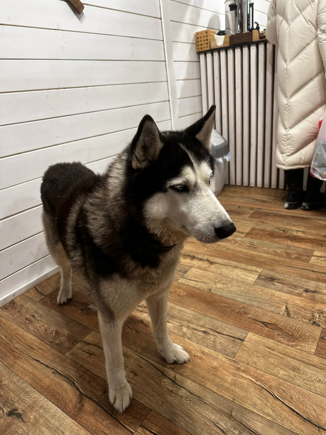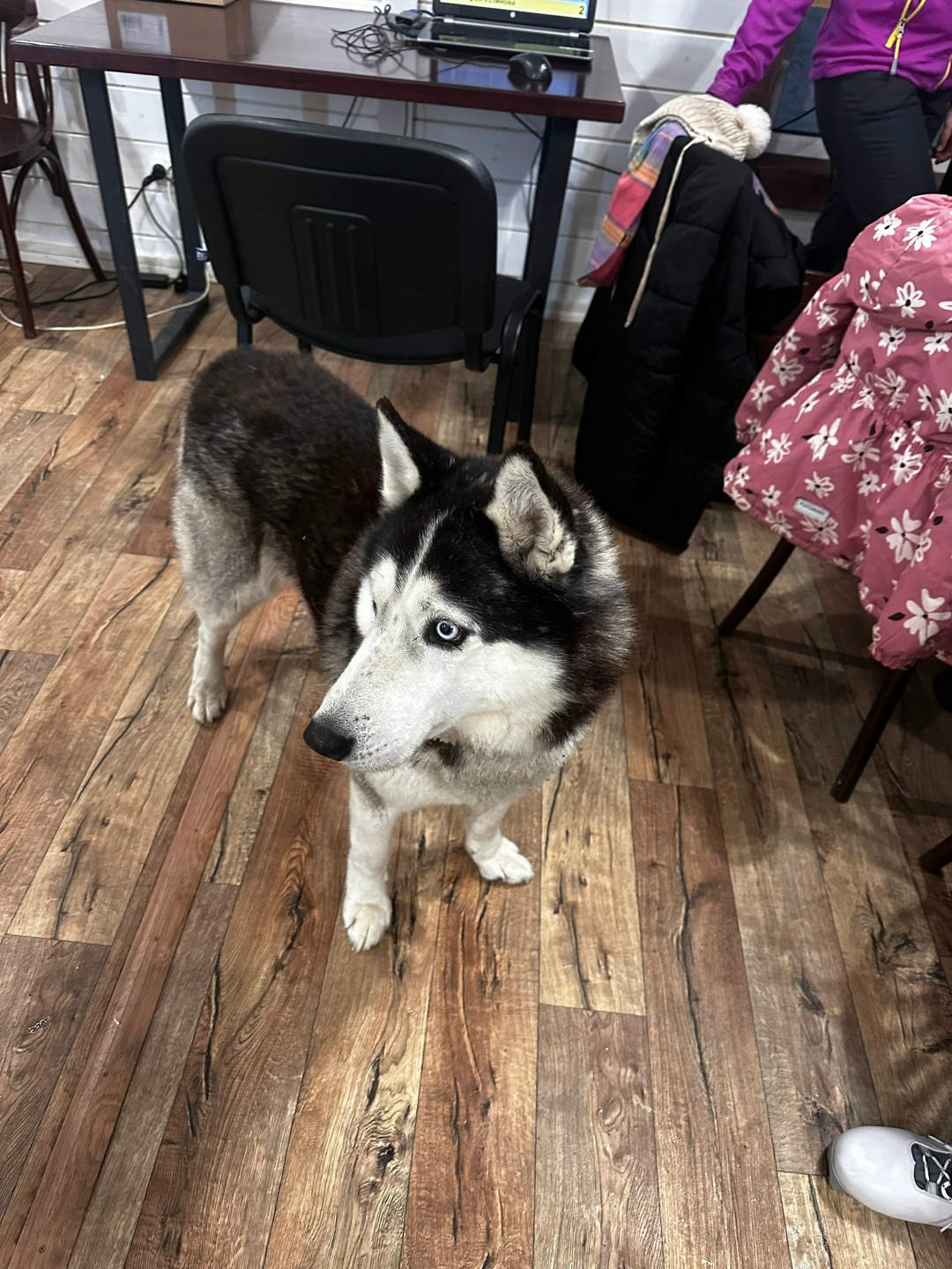 Около двух часов сидит хаски у кафе на трассе Фонтаны. Скорее всего потерялся. Людей не боится, знает команды. Актуально на 16:20