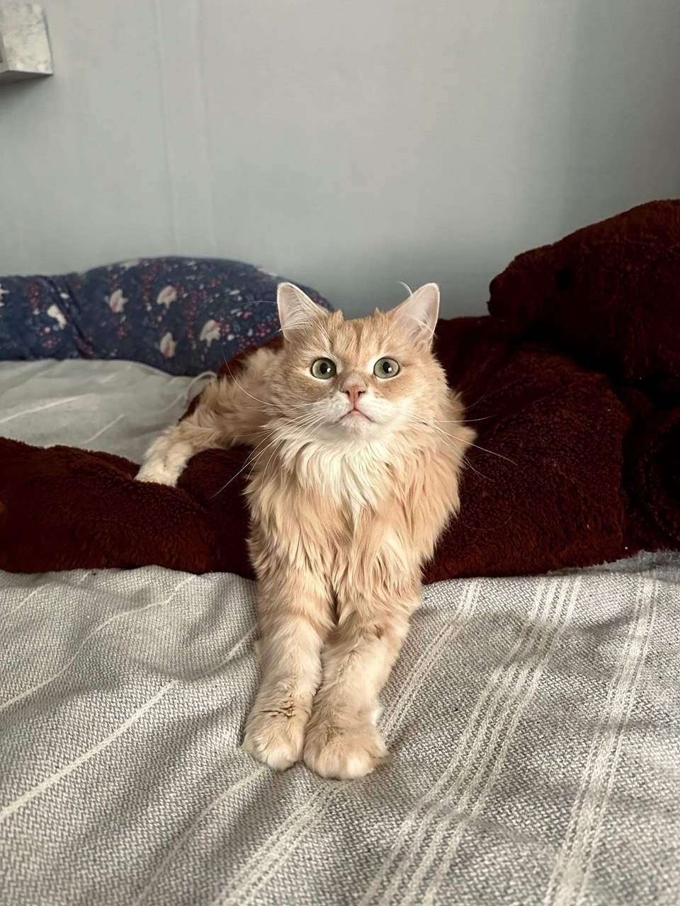 Отзывается на Симба, на кис-кис отзывается не охотнее. По размерам маленькая. Нос с горбинкой. На нижней губе темное пятнышко. Цвет рыжий-кофейный. Под правым ухом у мордочки царапины заживающие. Абсолютно не агрессивная, очень доверчивая, но может быть напугана.