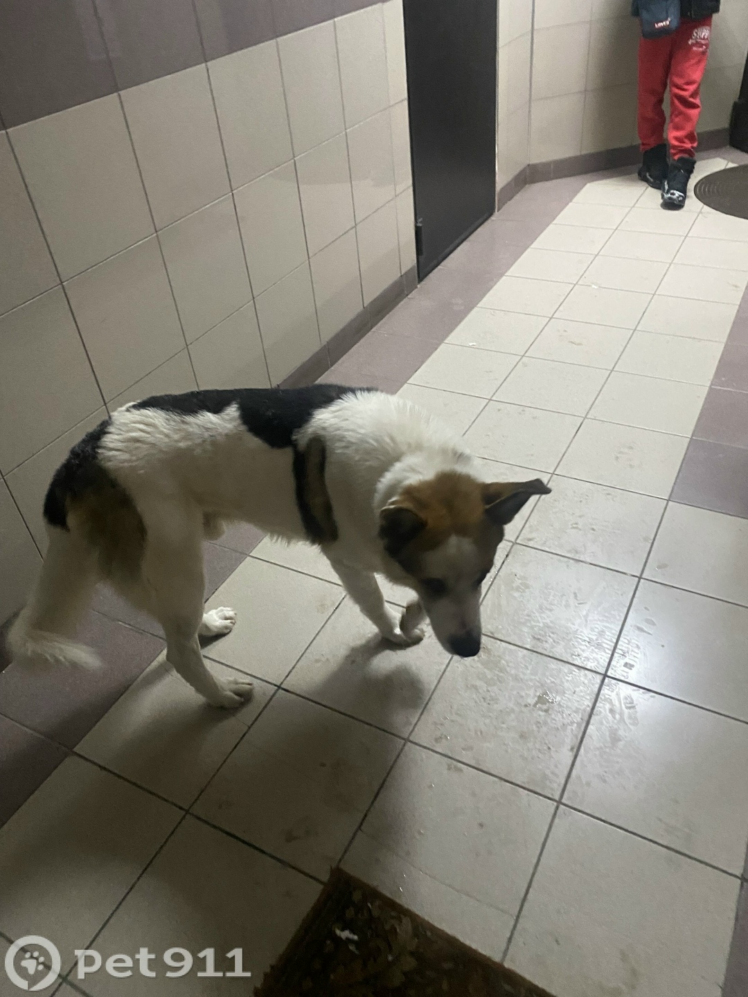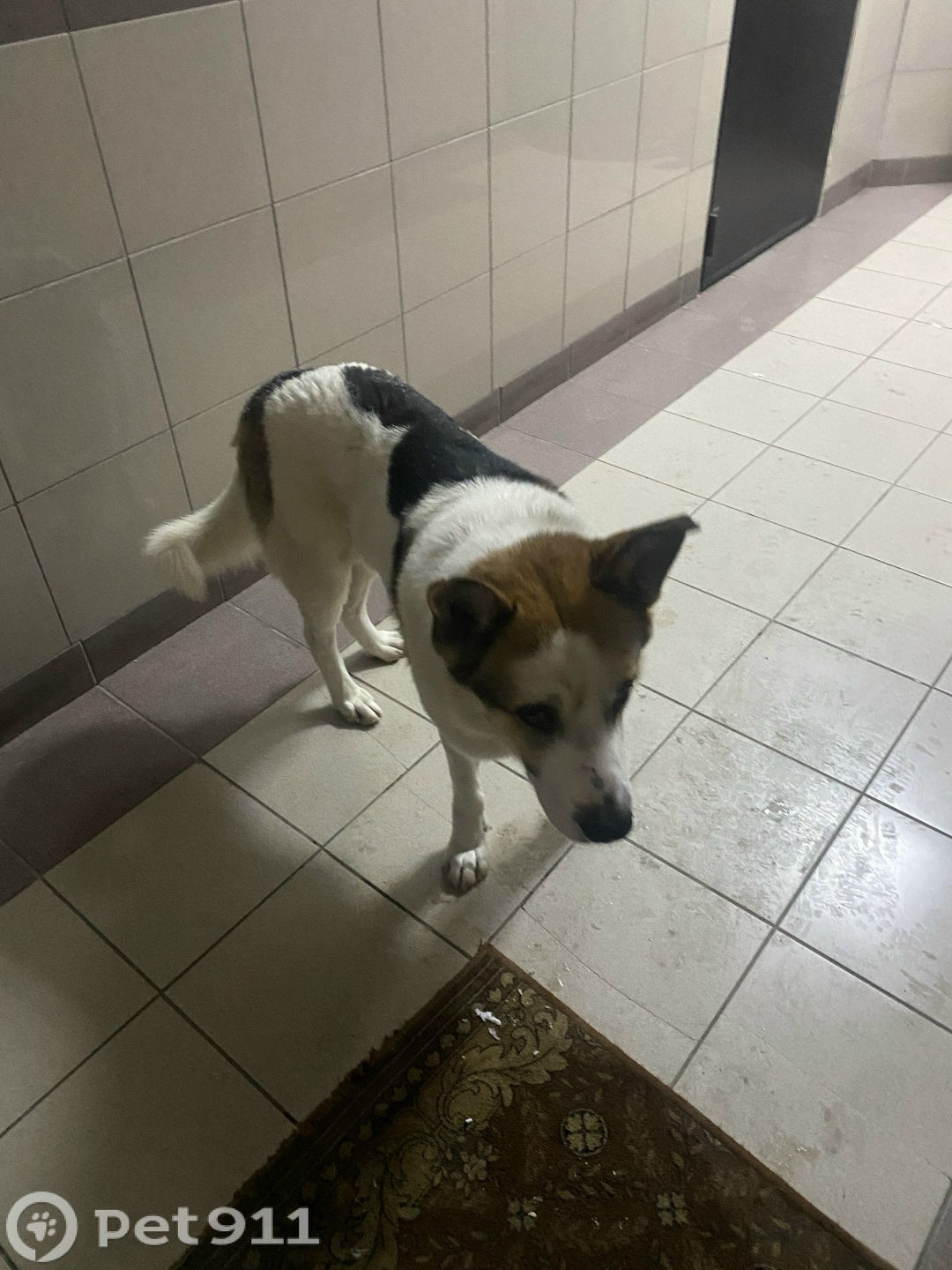 Средний размер, с кожаным ошейником , окрас белый рыжий темные пятна