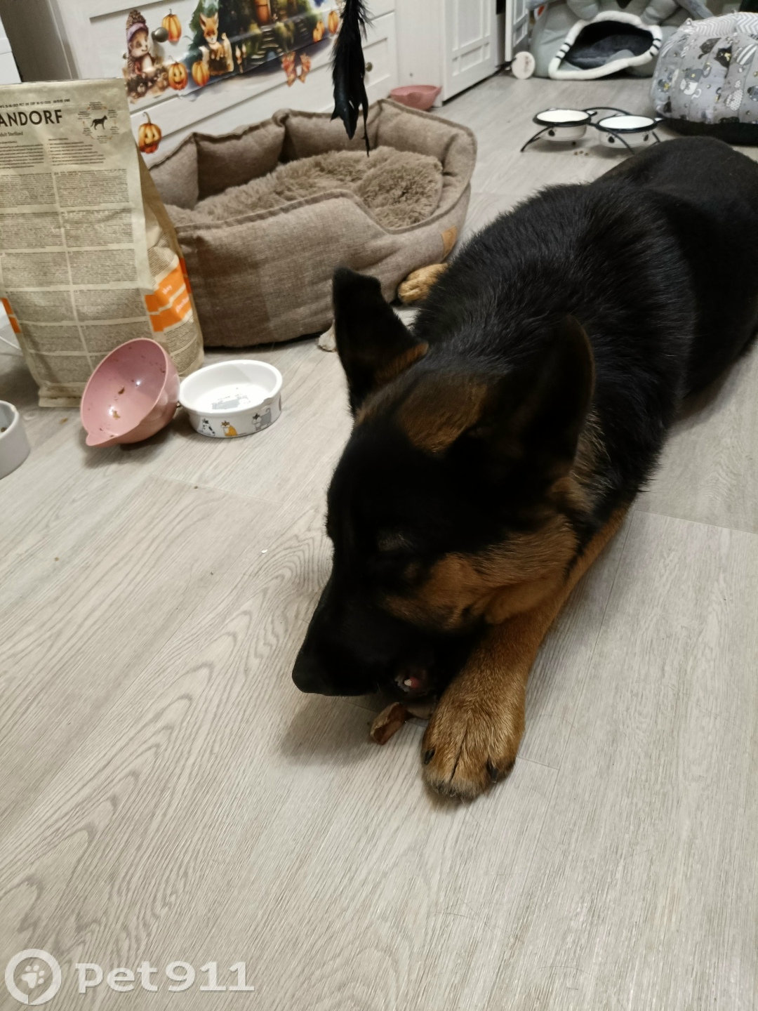 Найден щенок овчарки, 6-7 мес. Окрас чепрачный, дружелюбен, приучен к поводку и ошейнику, знает лежанки и ждет разрешения запрыгнуть на постель. Ест сухой корм, ориентирован на человека.