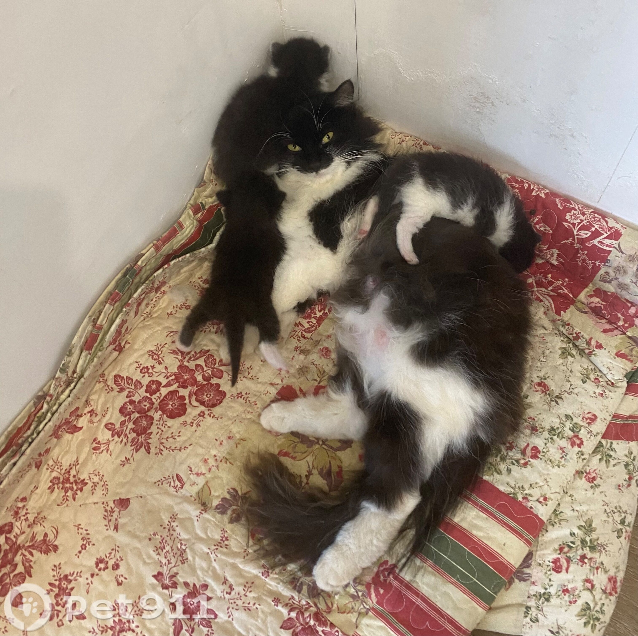 Очень пушистая кошечка, черно-белая, белое пузико, подбородок, немного мордочка, одна задняя и передняя лапы почти белые, а две другие в белых носочках. Немного пугливая