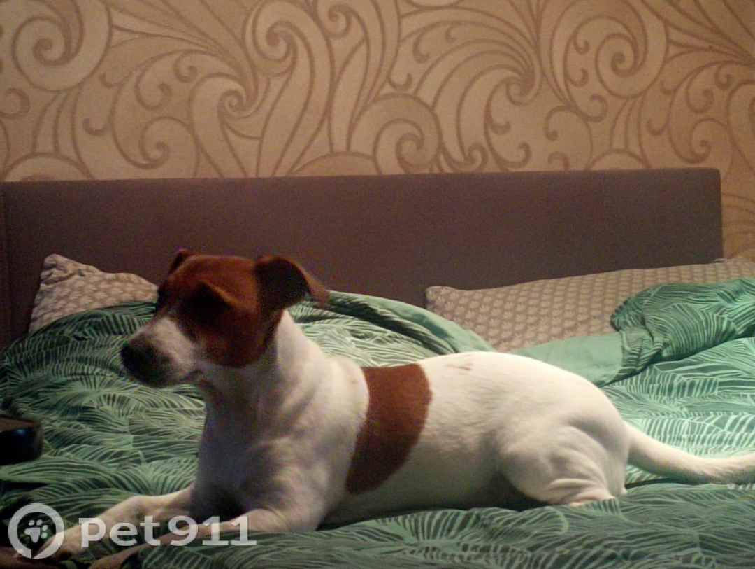 Собака Джек Рассел , девочка . Ушки и мордочка коричневенькие , на спине два коричневых пятна как крылья , на одной лапке есть черный ноготь . Очень ласковая и добрая