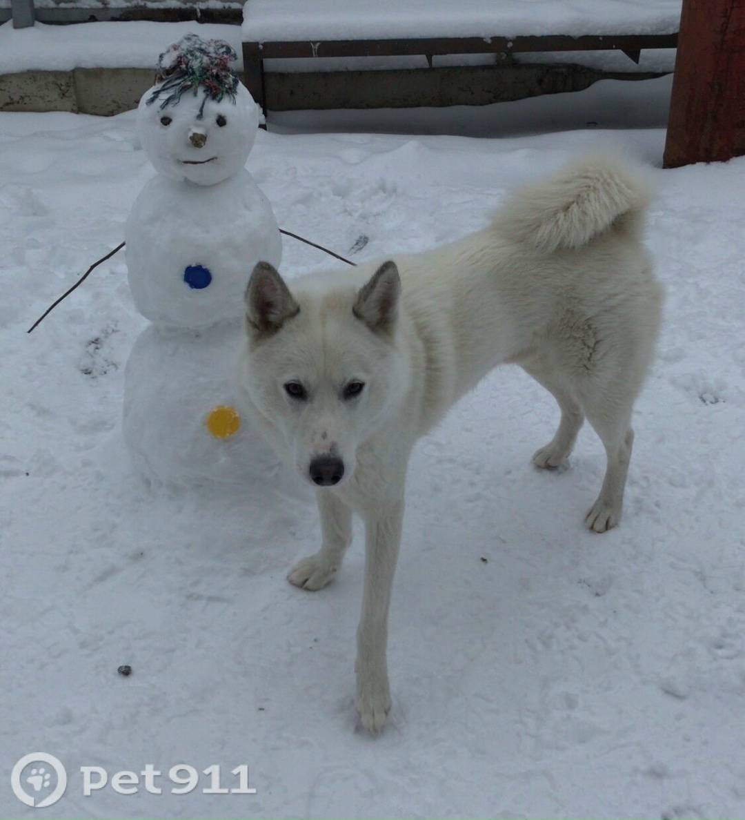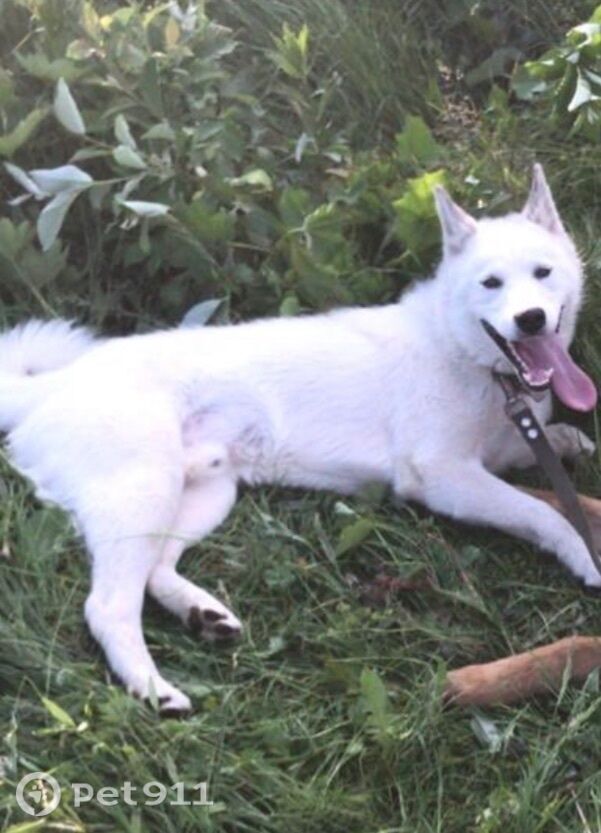 Белый, с бежеватым подпалом на спине, сероватые ушки и серое пятно на хвосте, на прогулке в лесу убежал за течной сучкой