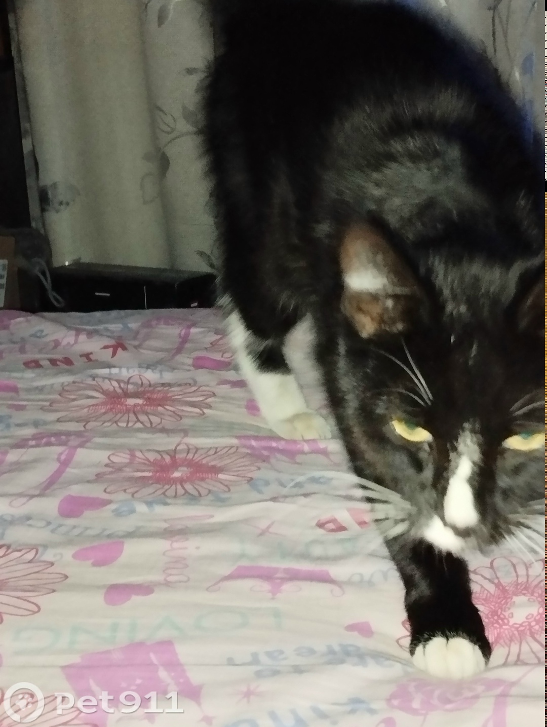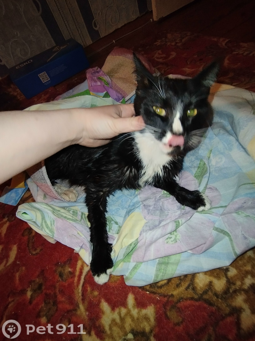 Некастрированный Черно белый кот, примерно год, ест сухой корм, очень ласковый, видимо домашний