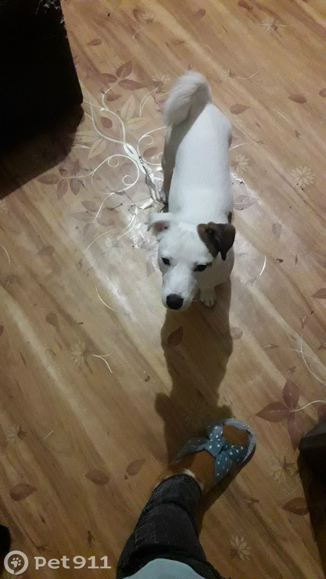 Джек Рассел,коричневое ухо и коричневое пятно с боку, остальное всё белое.Убежал со шлейкой но без поводка.Лает на всех но не с огресией а что бы поиграть.