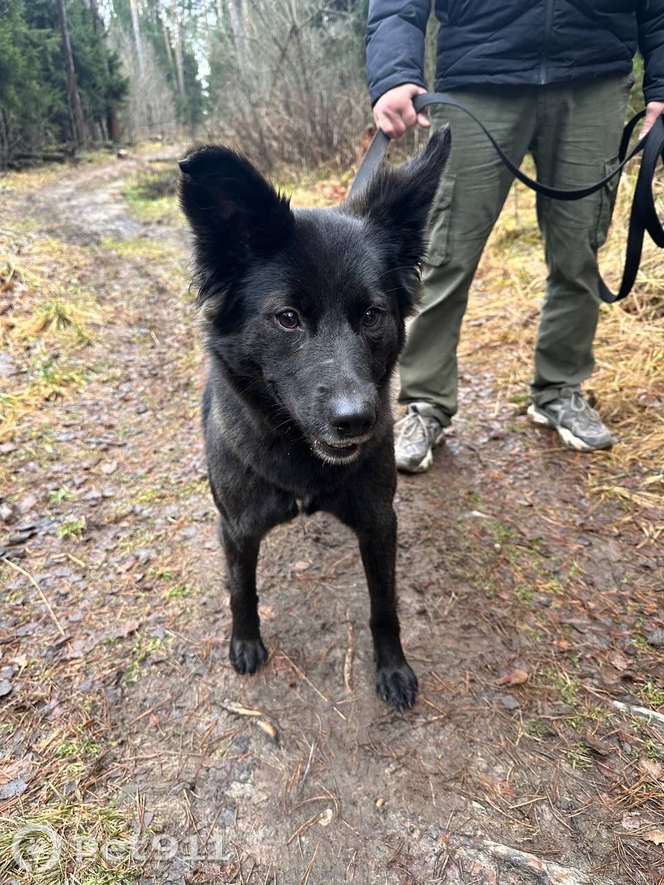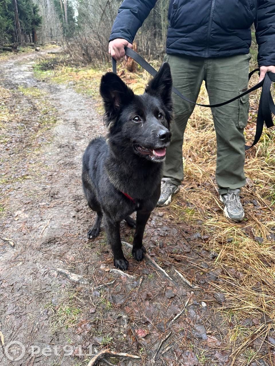 Черная сука с маленькой белой кисточкой в коричневый ошейнике.