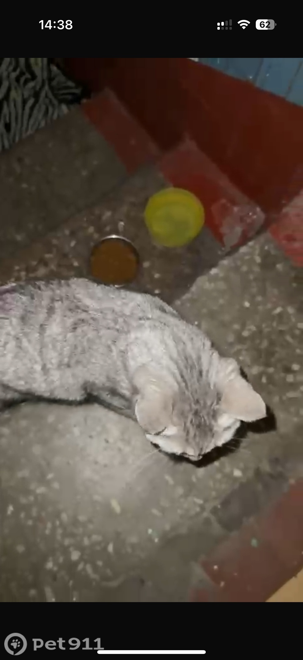 Серый окрас. Ласковая. 1,5 недели как найдена. Пожалуйста свяжитесь кто потерял своего потимца.