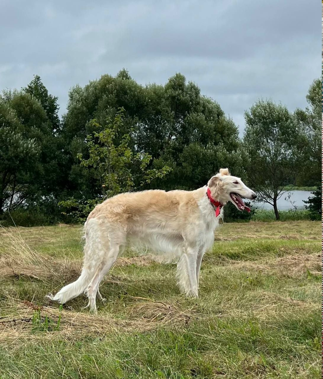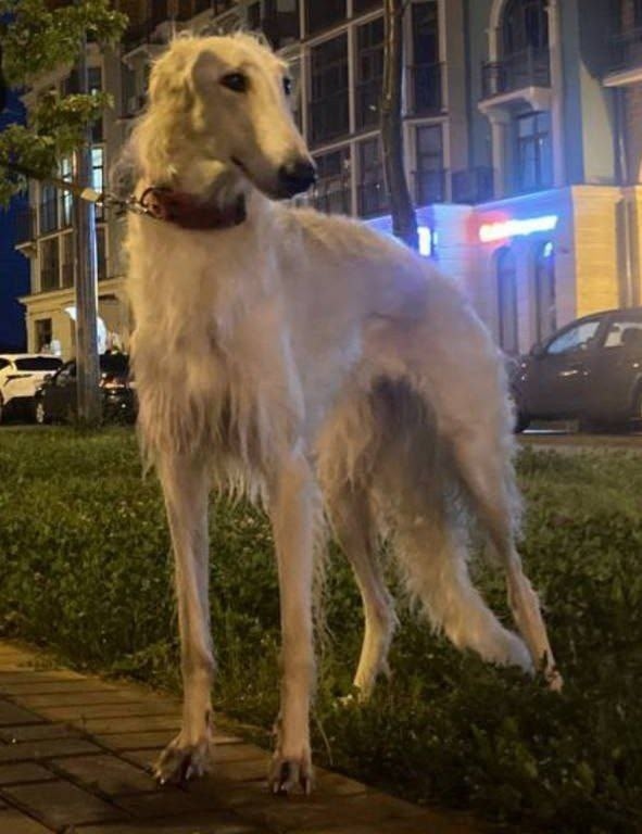 Еся: сука, русская псовая борзая,высокая,белая с кремовым оттенком по спине и бокам. Был надет красный ошейник. Убежала вместе с рулеткой. Очень добрая, не кусается и не лает.