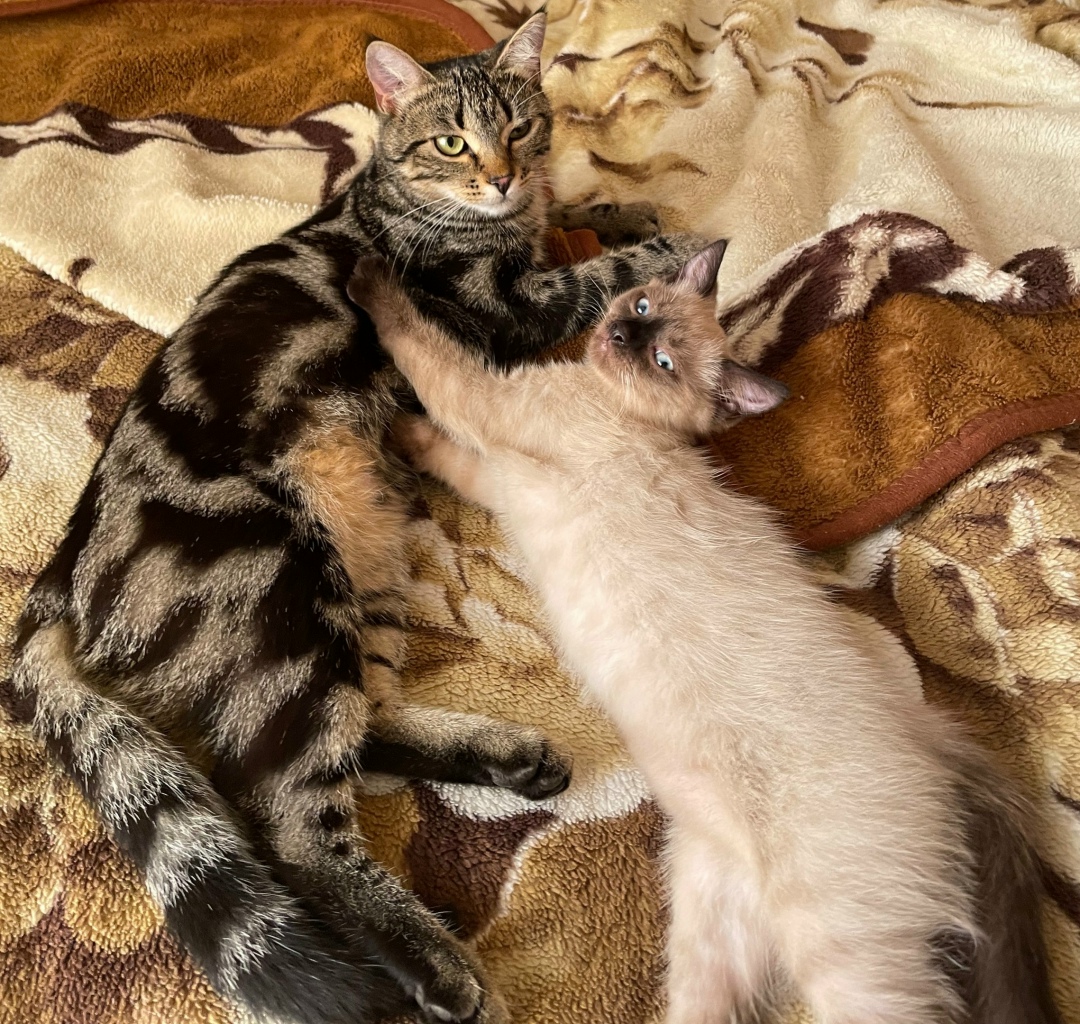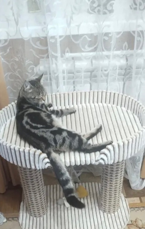 Кошка мраморного цвета (что-то похожее на бенгальскую, но серо-черная и некоторые пятна переходят в полосы), откликается на кличку Бина. Стерилизована.