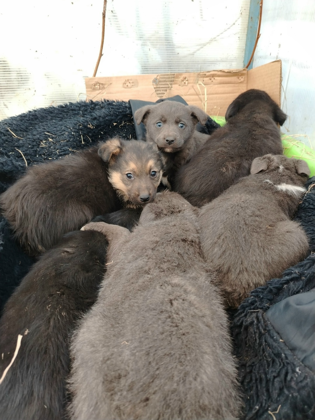 Проезжая мимо мусорки в Боровске, наш бывший волонтёр увидела малышей-щенков; она остановилась, но они испугались и спрятались под брошенным матрасом. Когда она туда заглянула, на неё смотрели шесть пар глаз малышей, наполненных страхом и ужасом. Ведь только вчера они были рядом с мамой, которая их кормила и согревала, а сегодня они лежат в холодном снегу, под мокрым матрасом. Их просто оставили там умирать.