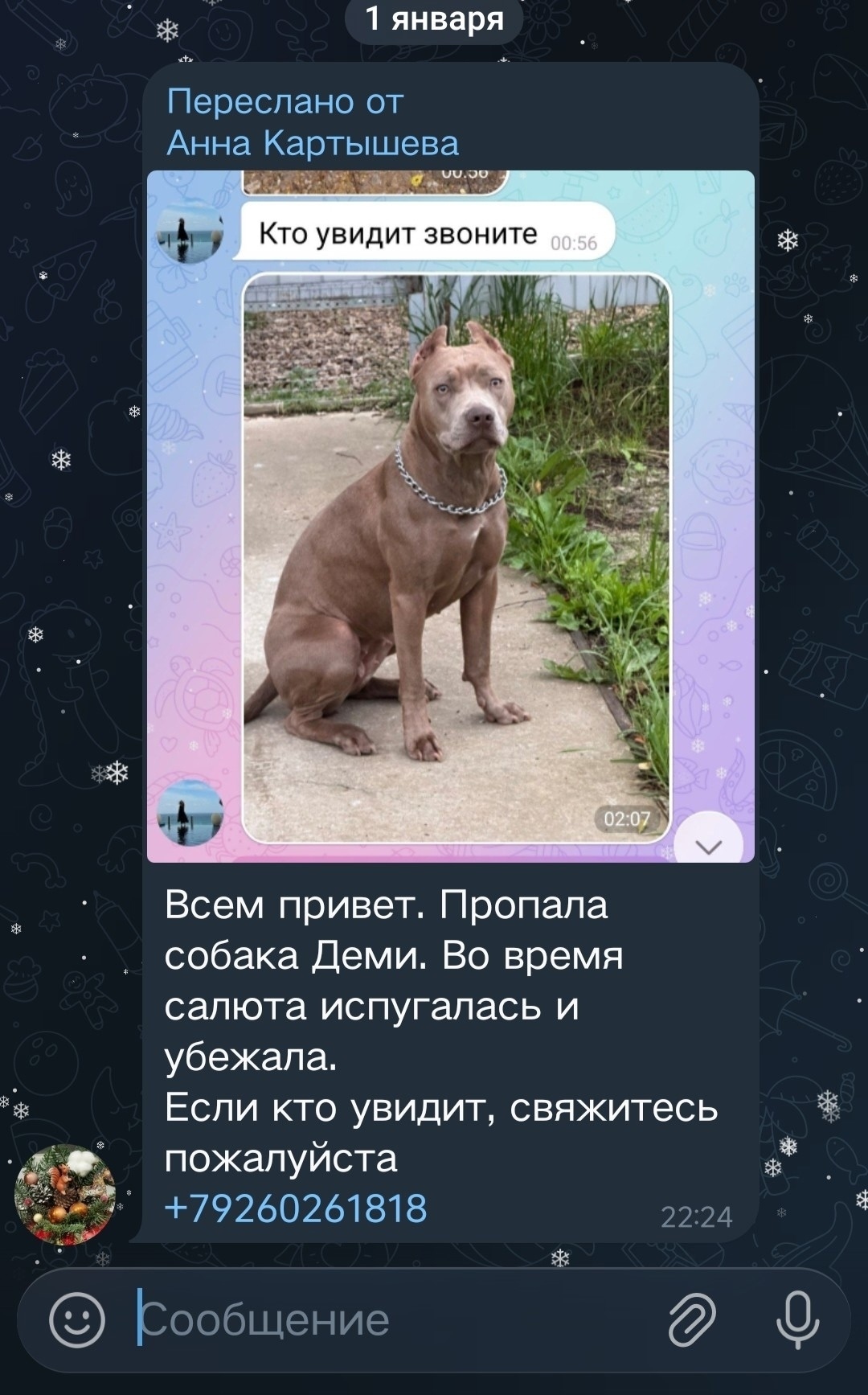 Пропала собака Деми. Во время салюта испугалась и убежала.