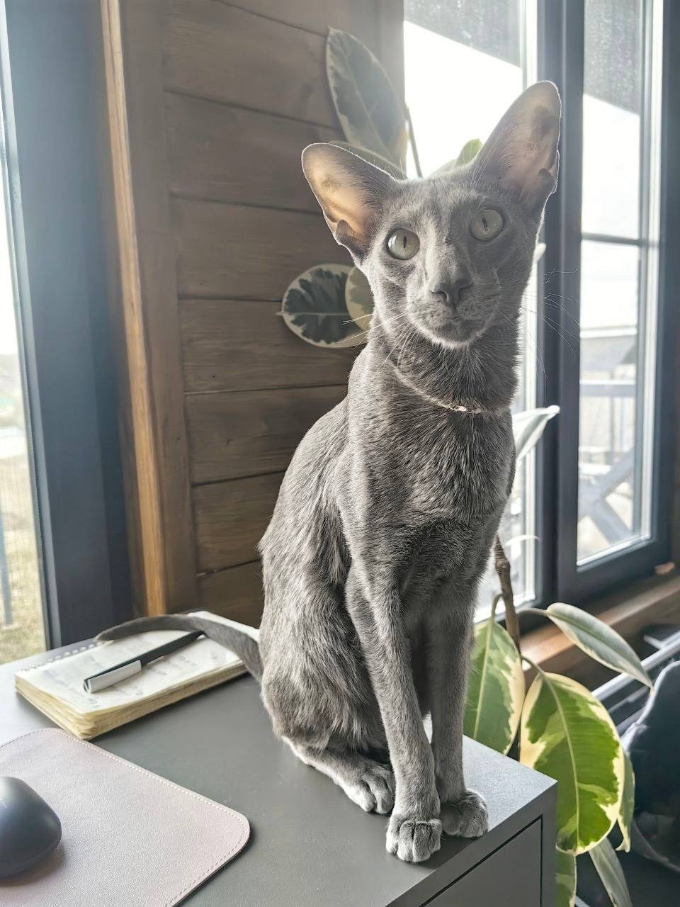 Серый ориентал, 2,5 года, кастрированный, шерсть короткая, гладкий, большие уши, разговаривает как человеческий ребенок. Прыгает на плечи. Обожает резинки для волос.