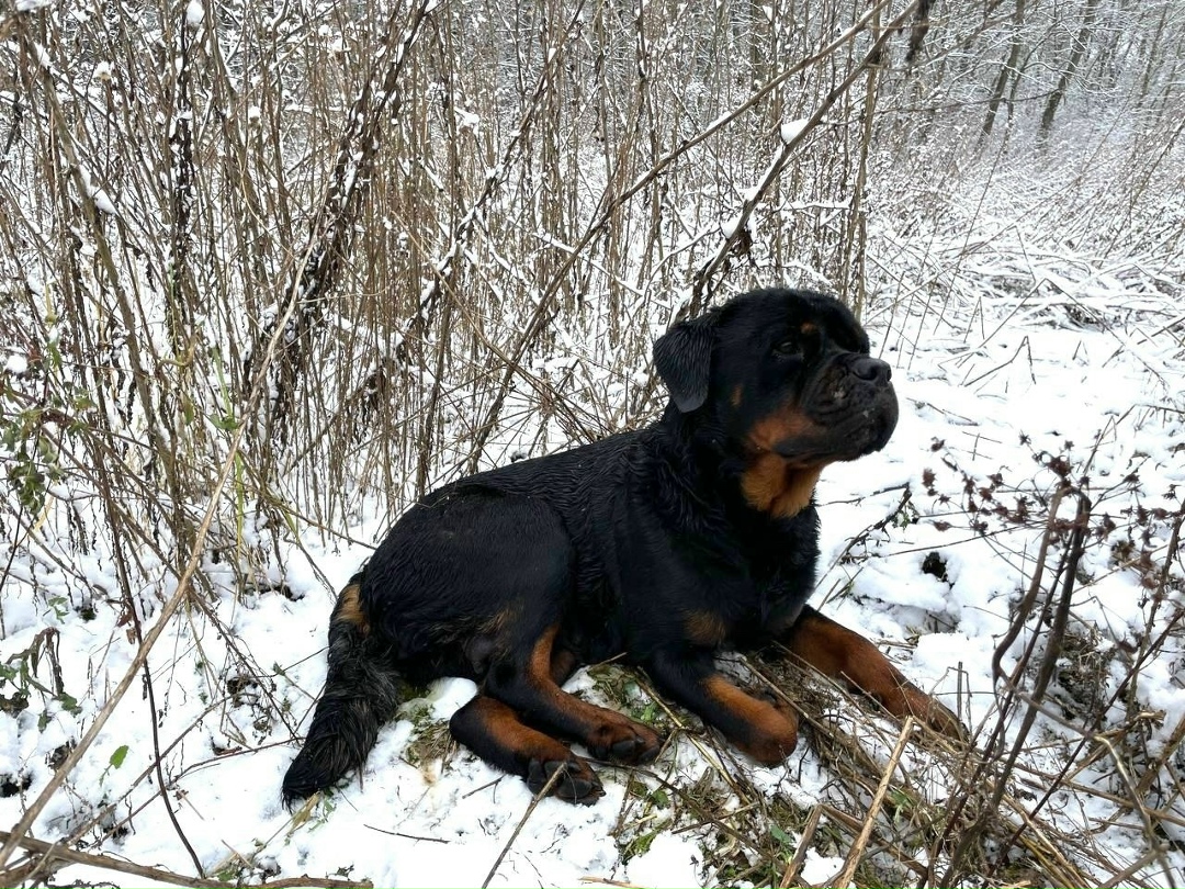 похожа на ротвейлера, пол не знаем. Не может ходить, видимо либо сбили на дороге, либо покусали. Тащит одну заднюю лапу. Может у кого-то с участка убежала?