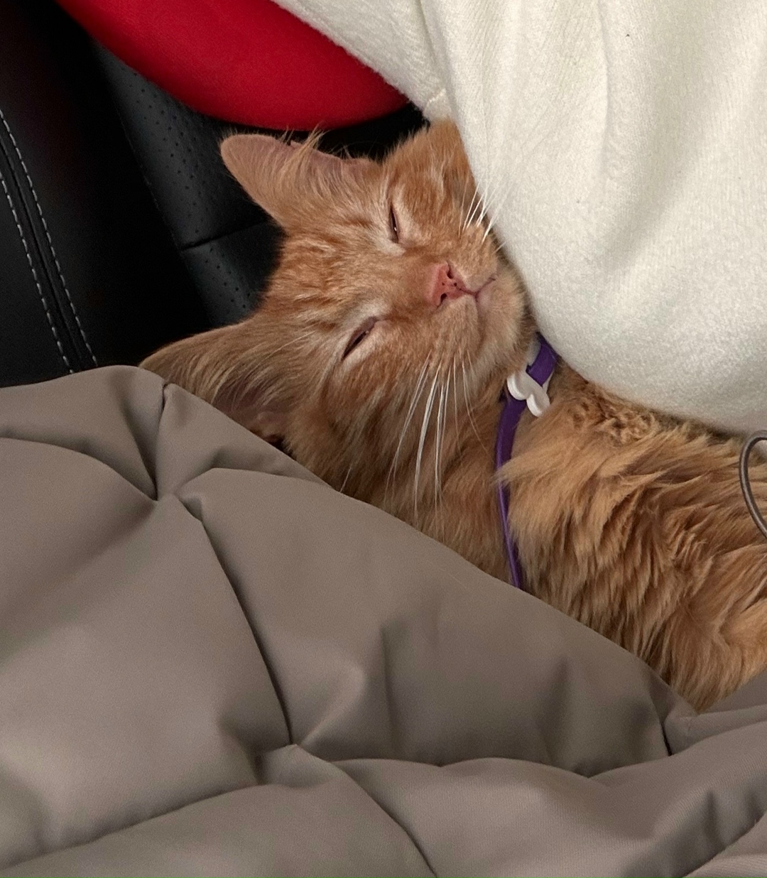 На кошке фиолетовый ошейник. Откликается на кличку «Пшеня/пшеничка»