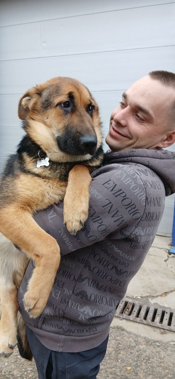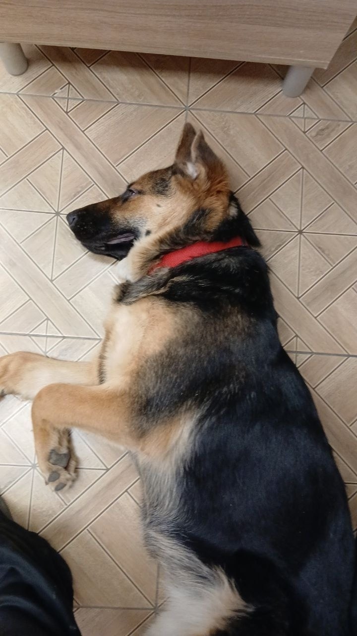 Немецкая овчарка, отзывается на кличку Медь, девочка, 8 месяцев, на шее красный ошейник и металлический адресник в виде косточки с номером телефона хозяина