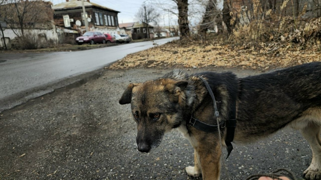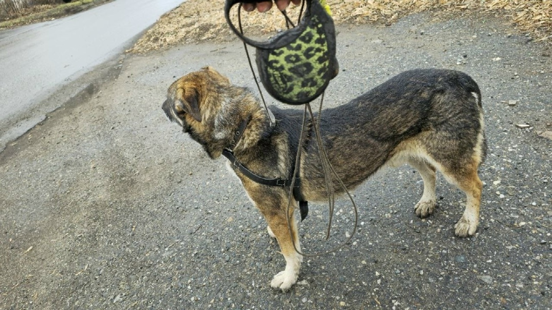 Найдена собака в шлейке и поводком рулеткой. Зацепился поводком за корягу и бежал с ней по проезжей части, рискуя угодить под машину.