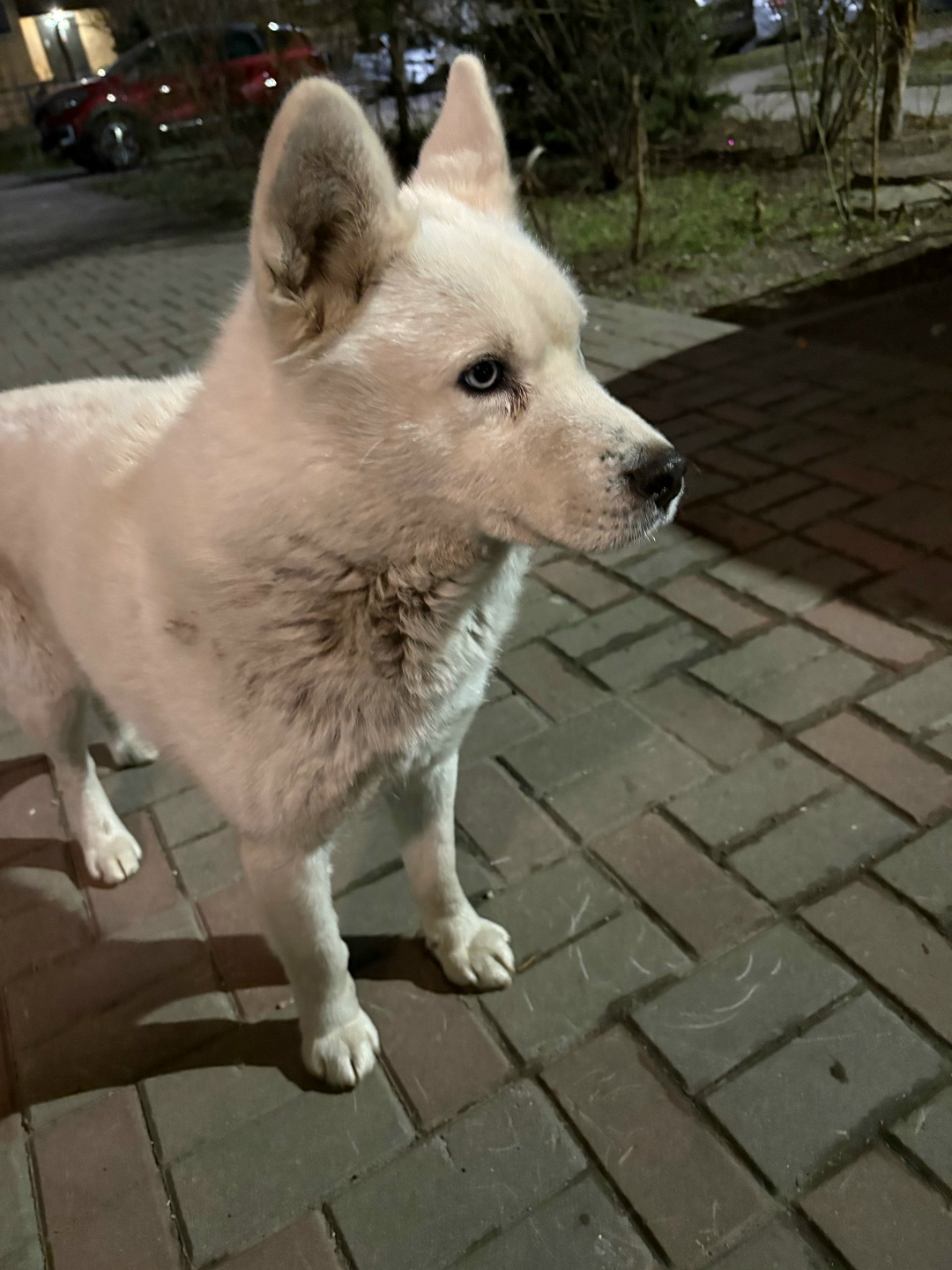 Оганова 16 прибилась собака,добряк по глазам ,вроде как есть следы от ошейника ,может у кого убежала ?уже второй день замечаю ее тут