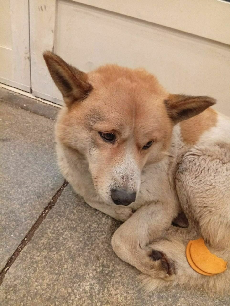 Мальчик. Окрас белый с рыжими пятнами. По типу похож на метиса сиба ину или акита ину. Милейший контактный пес.