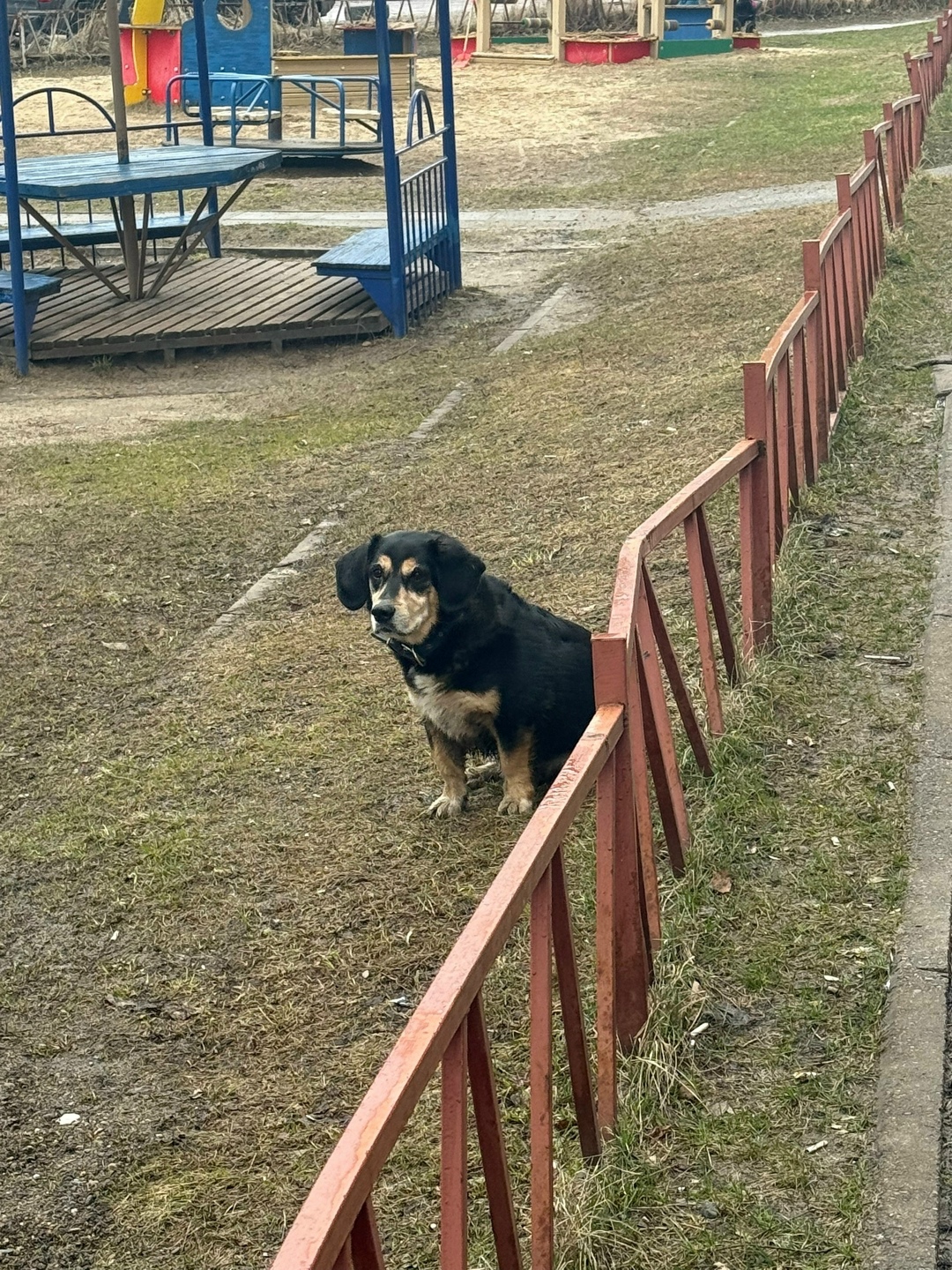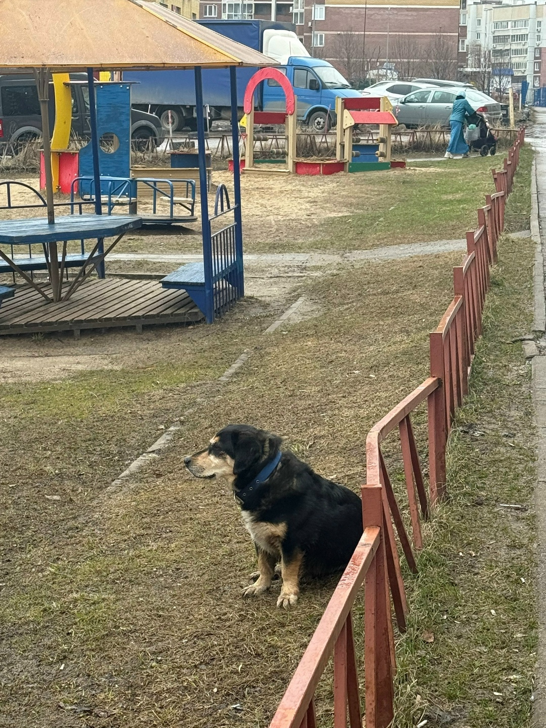 Найдена собака около дома Тыныч . Сидит на детской площадке. Все время смотрит по сторонам, как будто ищет глазами хозяина. Постоянно перемещается за людьми. Ошейник синий, безымянный. Хозяин, пожалуйста, найдись🙏 89869075034
