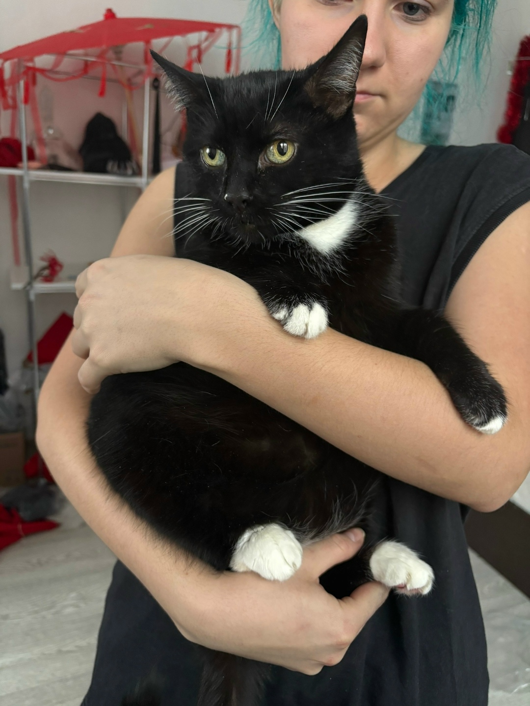 Приблизительный возраст 2-4 года,весь черный,кончики лапок и воротник белые,весит килограмм 10,вроде бы кастрирован.
