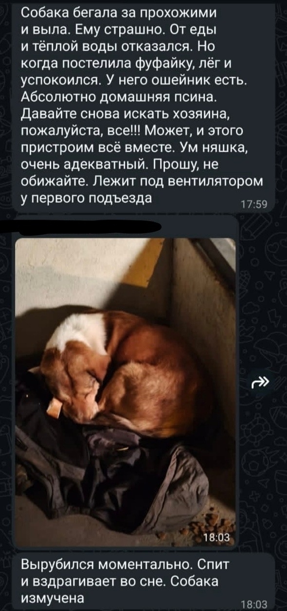Здравствуйте, найдена собака мальчик в районе пересечение Плехановской Кольцовской у Сбербанка. Была с ошейником и поводком. Сейчас находится у соседей