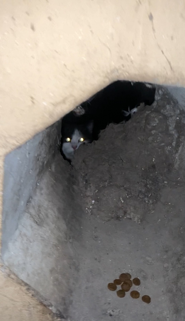 Но оказалось, всё это время он скрывался в подвале. И вот сейчас, спустя полтора месяца, выяснилось, что он всё ещё там, прячется и почти не выходит. Кот чистенький, очень пугливый и растерянный, очевидно, что он потерялся и совершенно не приспособлен к уличной жизни.