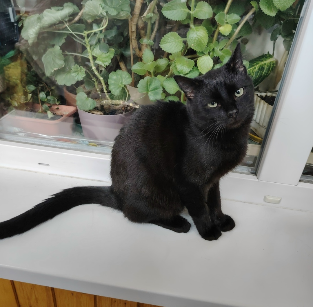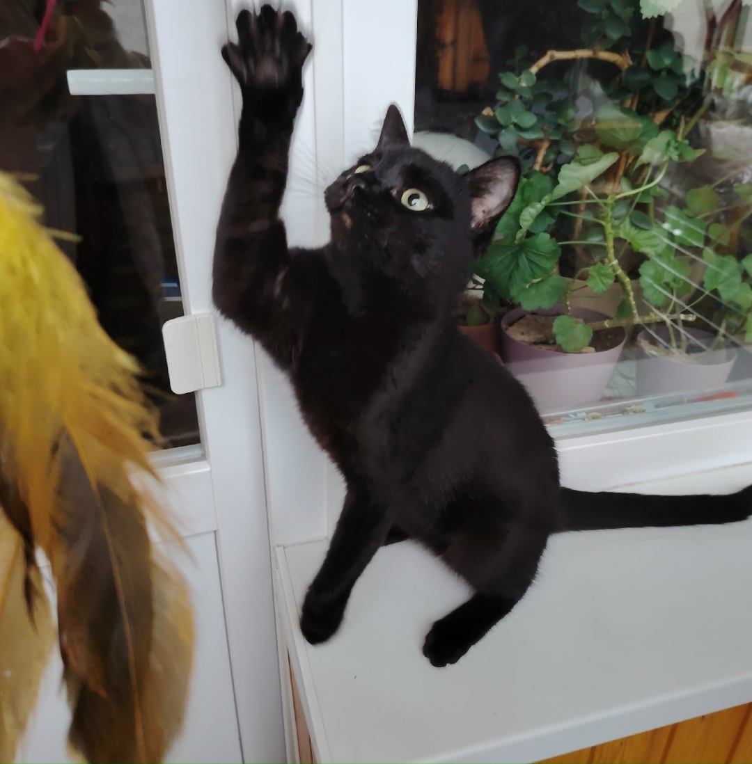 Это невероятно умный и позитивный котик! Шерсть блестит! Настоящая чёрная пантерка! Очень любит играть! Хорошо себя ведёт с другими животными на передержке, не задира и не забияка! С горшком нет проблем, ходит исключительно в лоток. Очень ждет своих самых лучших мам и пап!