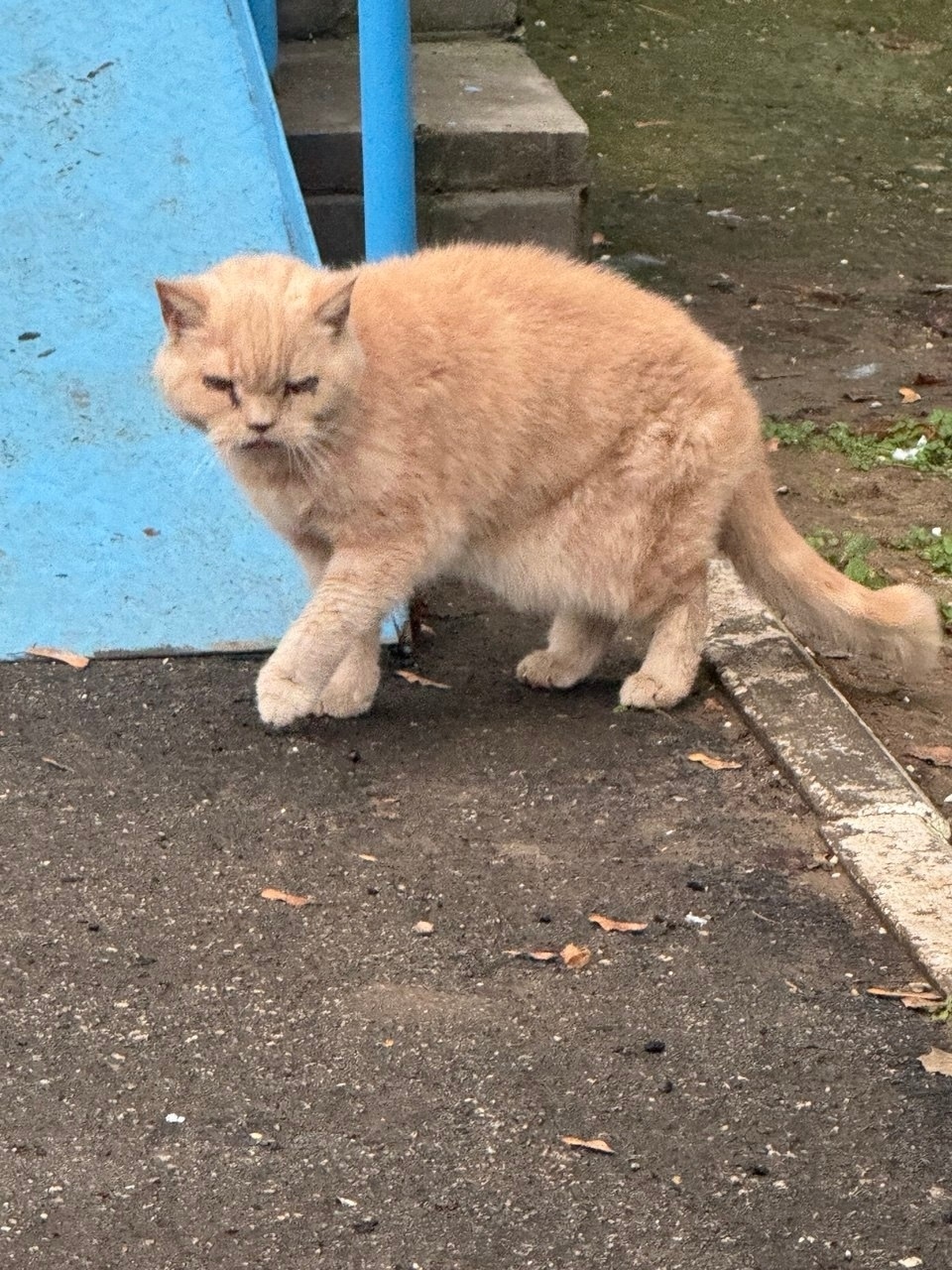 Кот постоянно плачет и прячется под ступенями. Мы кормим его, но выяснилась главная проблема: он слепой. Он не видит машин и собак и совсем не понимает опасности.