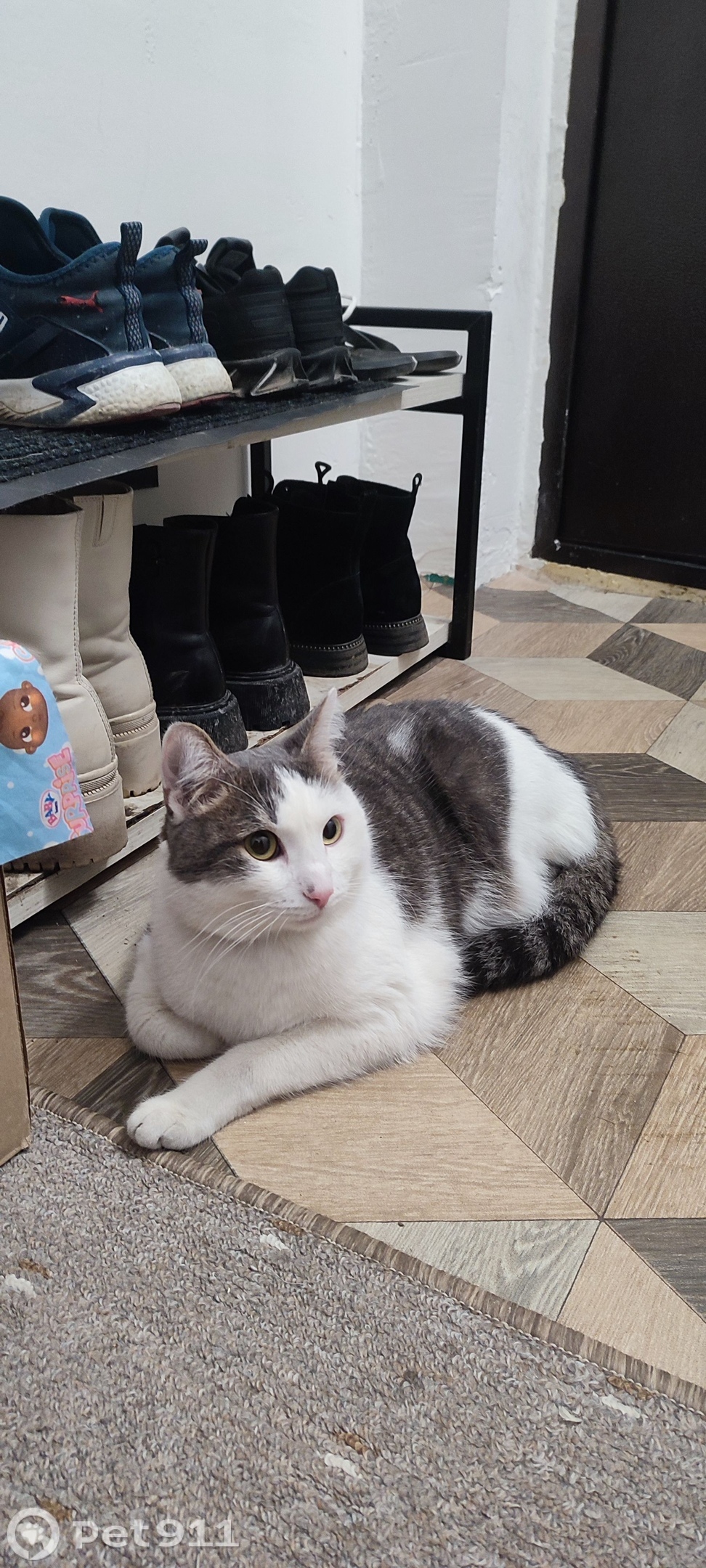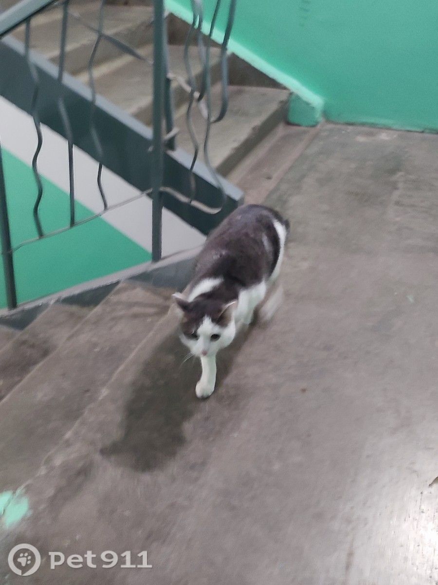 Серый с белым, на носу родинка ошейник чёрный, добрый, чистый, контактный. Появился в подъезде.