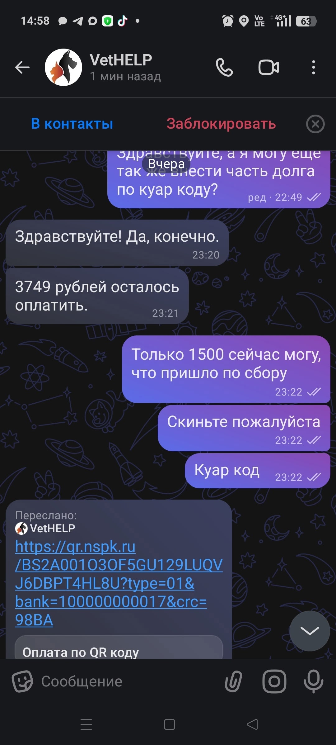 Сейчас перед клиникой вет хелп остался долг 2.249 и отдельно кремация 5500 , у меня больше нету своих средств оплатить,кураторы тоже не отозвались,а если я не оплачу долг то меня просто занесут в чс и больше не примут даже со своими животными не говоря за бездомных, мне даже бумаги с чеками не могут выдать на руки, потому что такие правила в вет хелпе, пока полностью не оплачин будет долг, они ничего не отдадут, даже собаку, котороя будет у них находится в морозилке, я хотела договориться с крематорием для животных, чтобы они приехали и забрали труп собаки , потому что через них кремация дешевле, но вет хелп сказал, что собаку мне не отдадут, пока я не закрою долг, помогите закрыть долг в клинике пожалуйста, чтобы собака не валялась у них в морозильнике, а отпустить её уже в тот мир, как положено😢