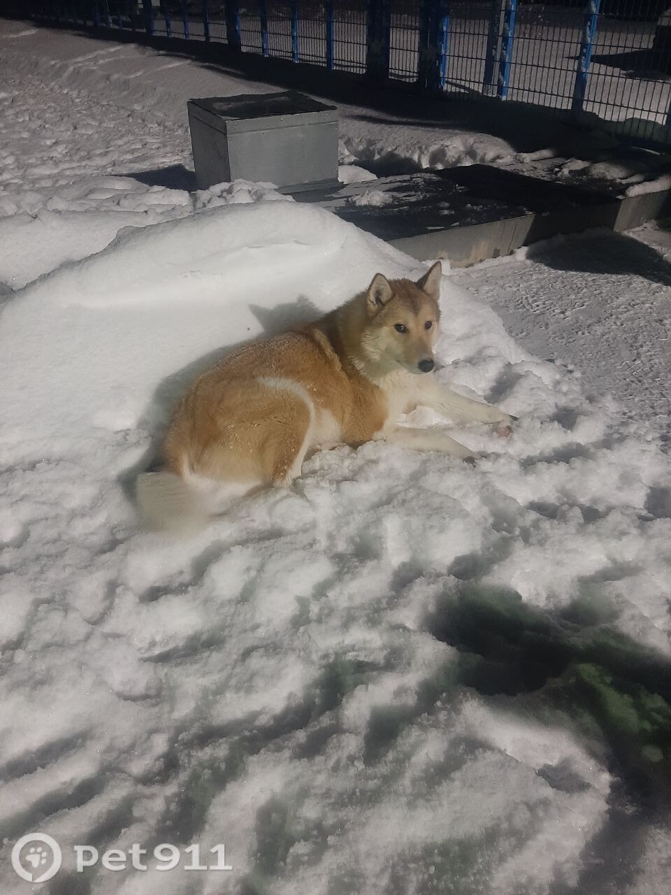 Девочка, лайка месяцев 8, упитанная, окрас белый с рыжим. Людей не боится.