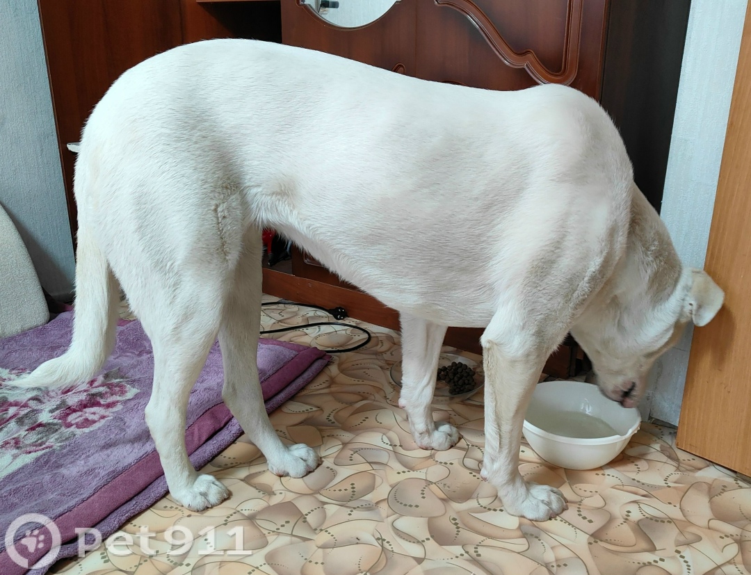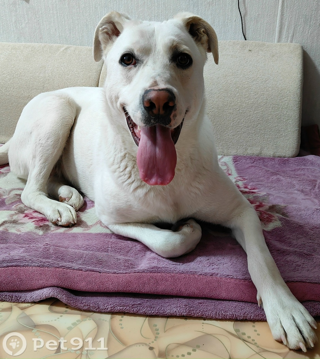 Была найдена без ошейника и бирки. Проверили наличие чипа -нет. Окрас белый, на морде черные пятна. Девочка молодая, метис (похожа на помись Алабая). Добрая, ласковая, умная. Ухоженная, подстрижены когти и шерсть рядом с подушечками на лапах, видно что домашняя! Если не найдем хозяина, ищем новый дом и любящих хозяев этой булке ️