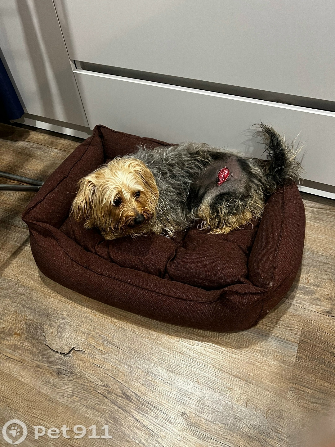Домашняя собака, 3-4 года. Есть рана на бедре, лишай не подтвержден. Пуглива, но легко ведет себя у ветеринара и в машине.