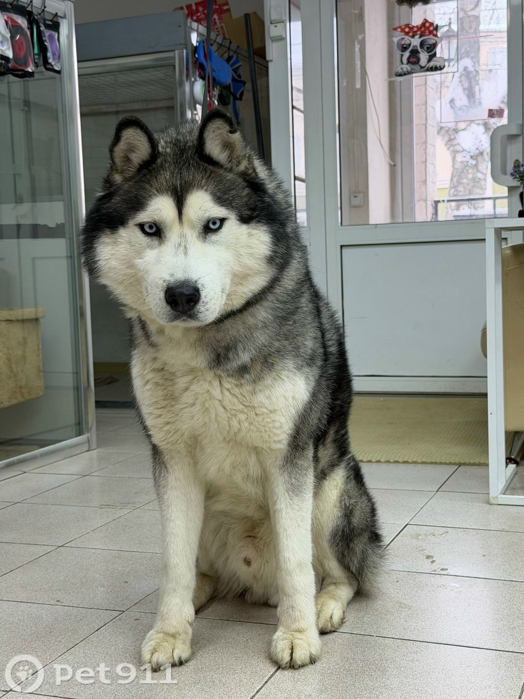 Голубоглазый хаски в ухоженном коричневом ошейнике, очень контактный и дружелюбный, в клетку зашел как к себе домой, придержать можем только до вечера