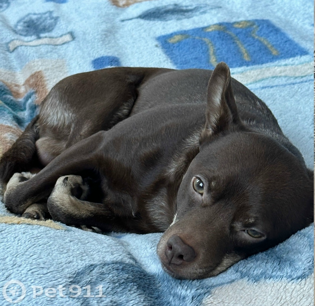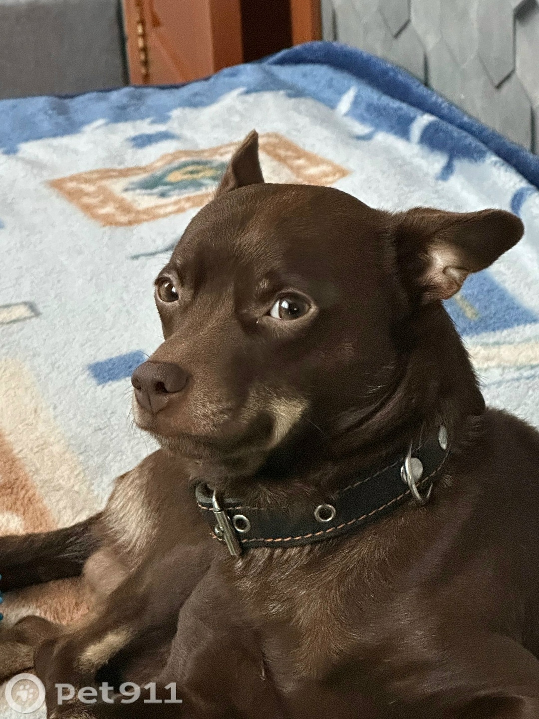 Небольшая собака коричневого цвета. На собаке надет ошейник, на ошейнике есть зеленая резинка.